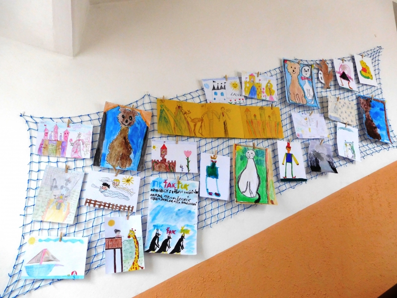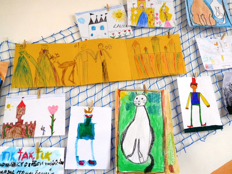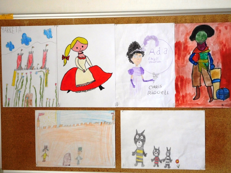 Výstavka všech ilustrací je umístěna na chodbě knihovny