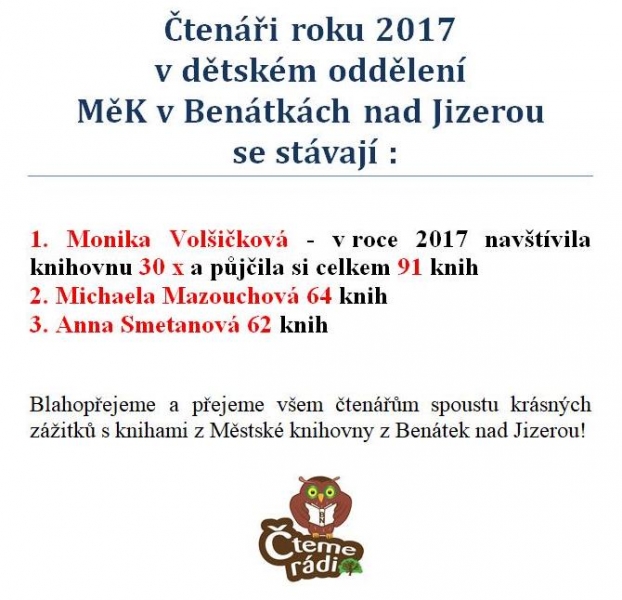 OCEŇOVÁNÍ NEJPILNĚJŠÍCH ČTENÁŘŮ DĚTSKÉHO ODDĚLENÍ ZA ROK 2017