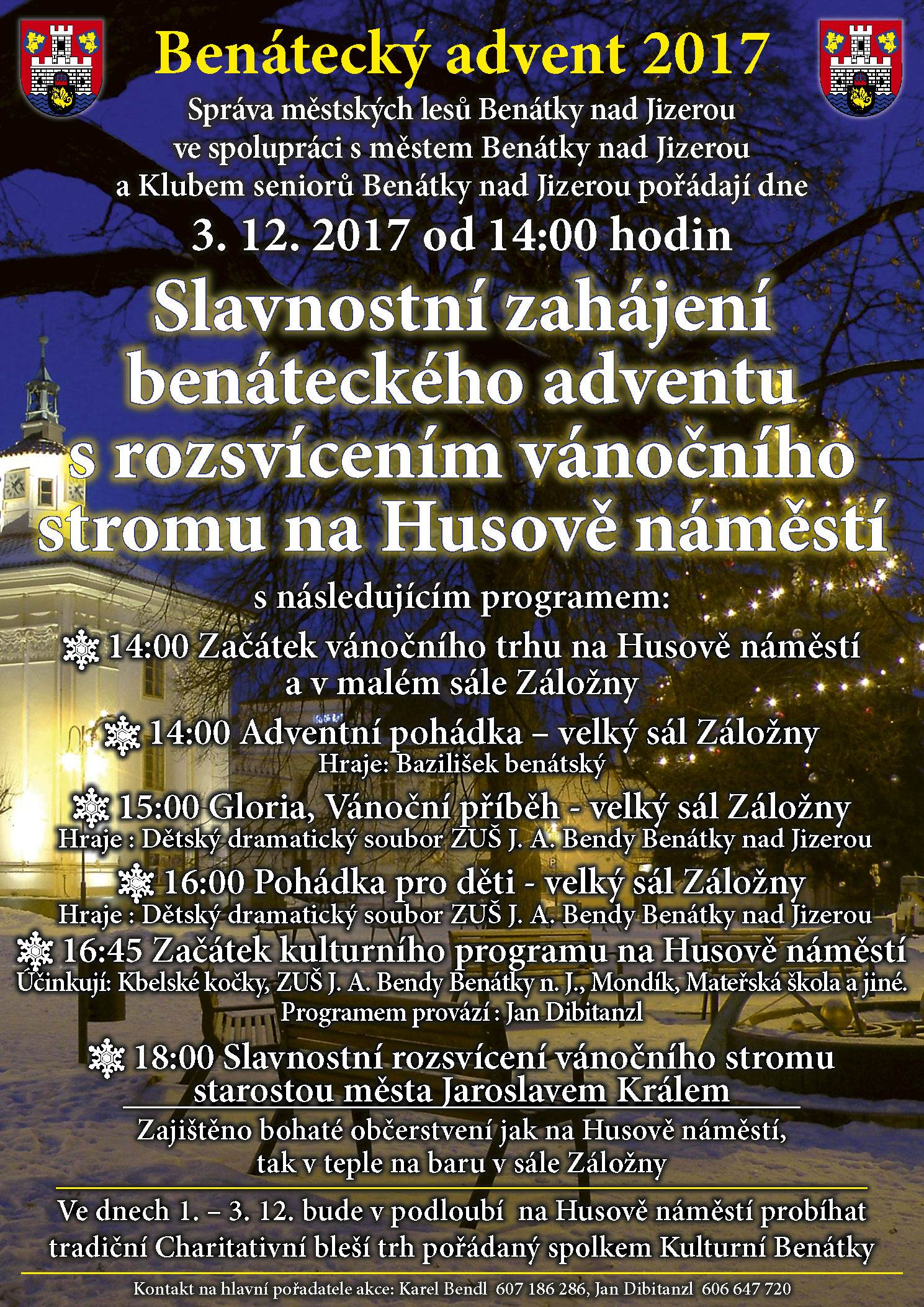 Správa městských lesů a město Benátky nad Jizerou srdečně zvou na slavnostní zahájení benáteckého adventu s rozsvícením vánočního stromu na Husově náměstí, které se uskuteční v neděli 3.12.2017. Plakát s programem zde
