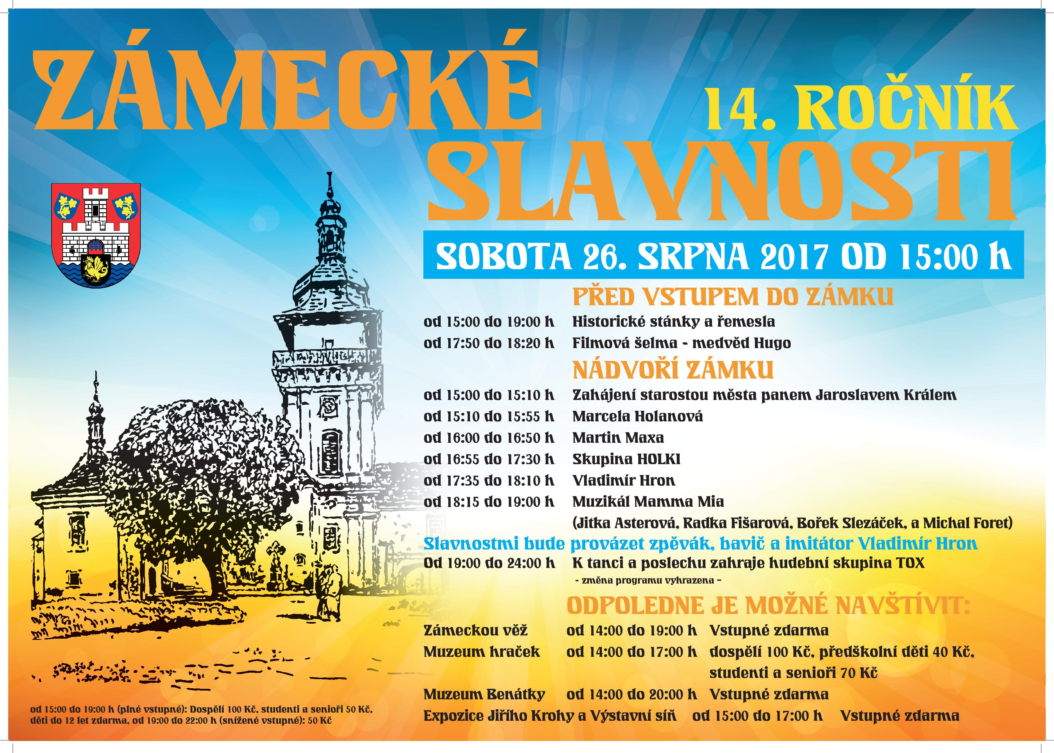 Město Benátky nad Jizerou srdečně zve na 14. ročník Zámeckých slavností. Akce se uskuteční v sobotu 26. srpna 2017 od 15:00 hodin. Připraven je bohatý kulturní program.