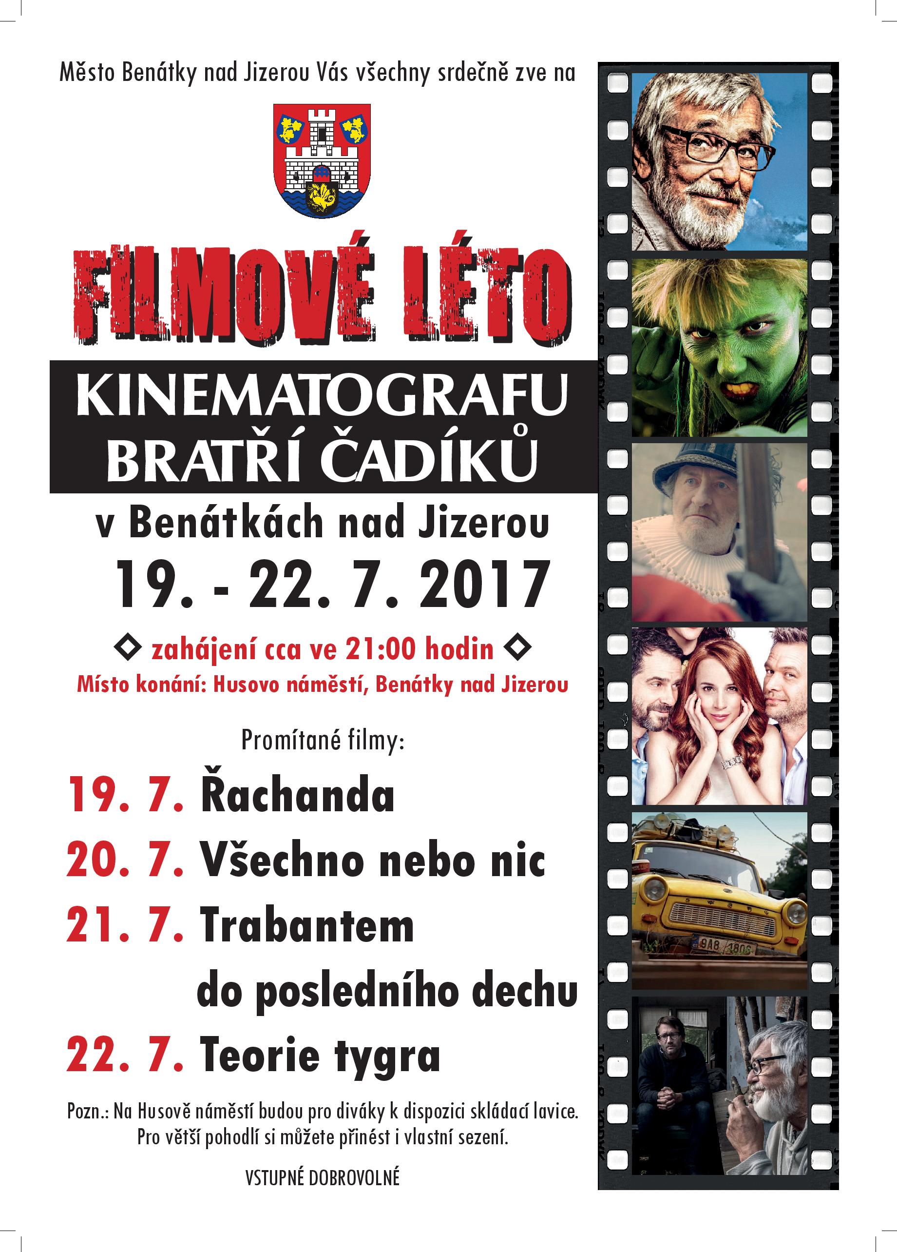 Město Benátky nad Jizerou srdečně zve na další filmové léto Kinematografu bratří Čadíků, které letos proběhne ve dnech 19. - 22.7.2017. Začátky promítání cca ve 21:00 hodin. Info zde