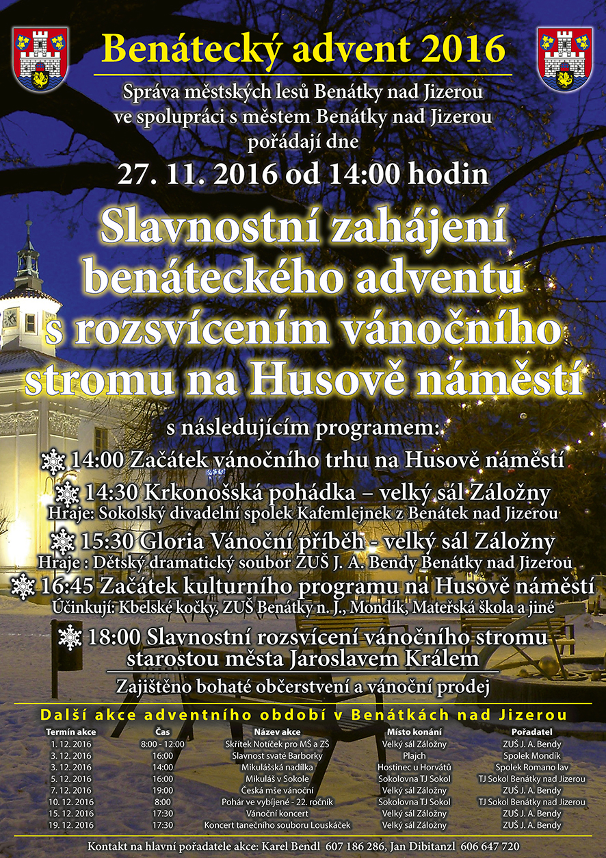 Správa městských lesů Benátky nad Jizerou ve spolupráci s Městem Benátky nad Jizerou srdečně zve na tradiční předvánoční akci na Husove náměstí dne 27.11.2016 od 14:00 hodin. Plakát přílohou