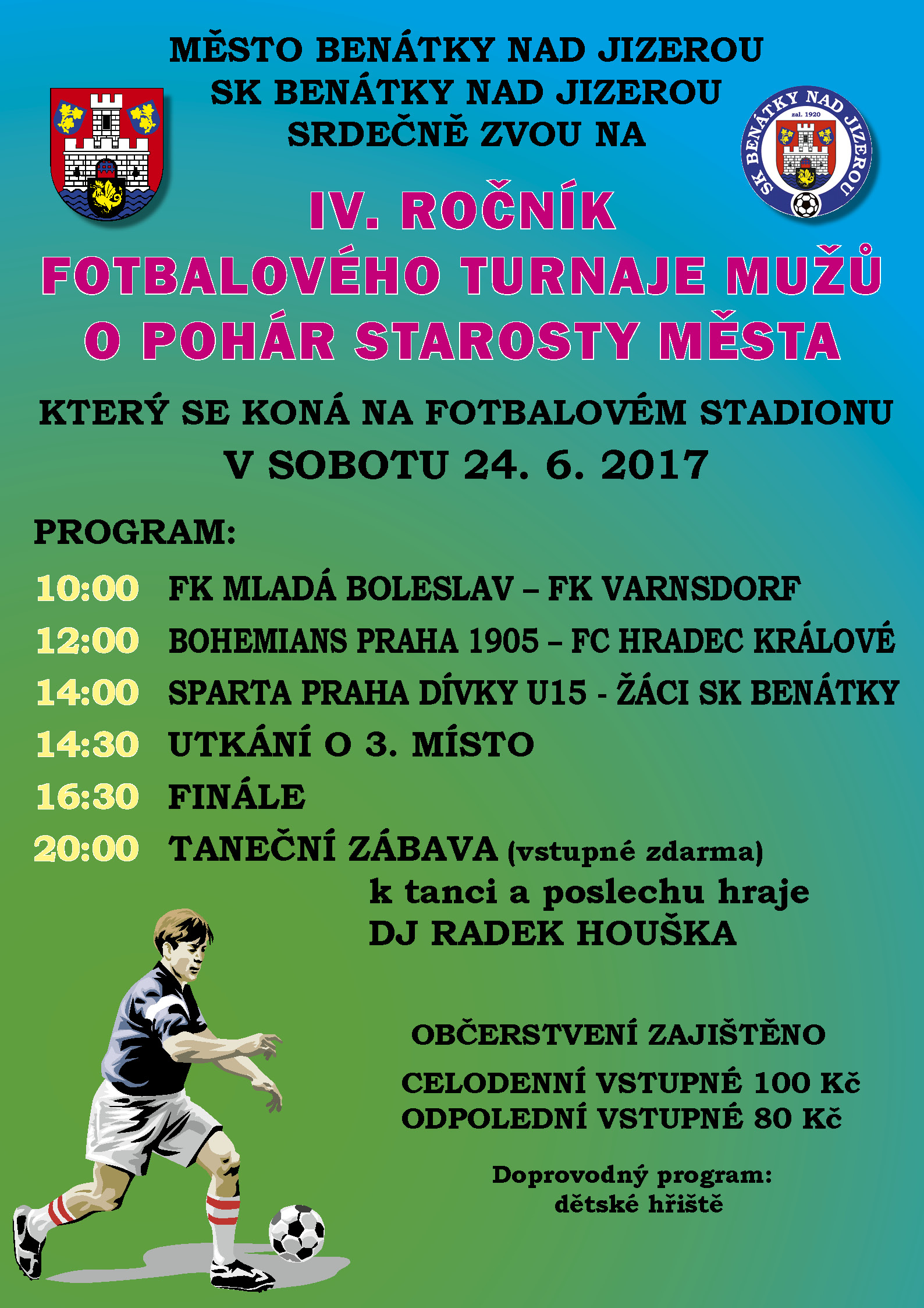 Město Benátky nad Jizerou a SK Benátky nad Jizerou srdečně zvou na další ročník fotbalového turnaje "O pohár starosty města", který proběhne 24.6.2017 od 10:00 hodin na fotbalovém stadionu v Benátkách nad Jizerou. PROGRAM AKCE