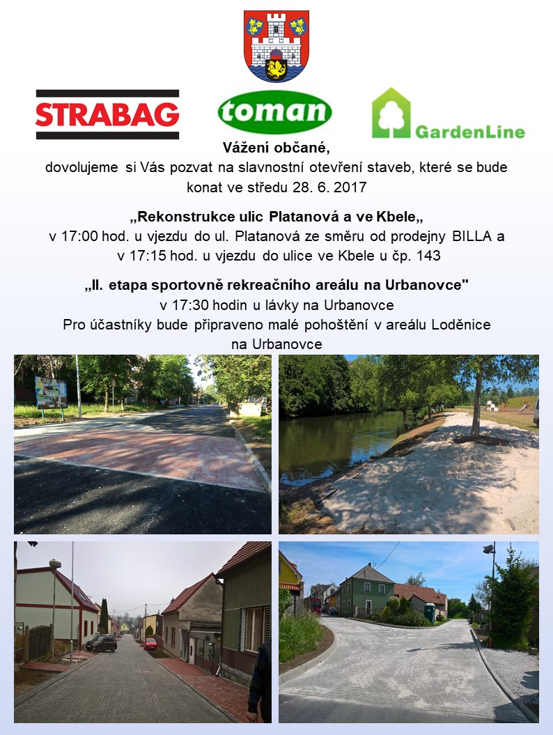 Město Benátky nad Jizerou srdečně zve na slavnostní otevření staveb: "Rekonstrukce ulic Platanová a ve Kbele" a "II.etapa sportovně rekreačního areálu na Urbanovce". Slavnostní otevření proběhne ve středu 28.6.2017 v časech 17:00 (ul. Platanová), 17:15 (ulice ve Kbele) a 17:30 (sportovně rekreační areál na Urbanovce). POZVÁNKA