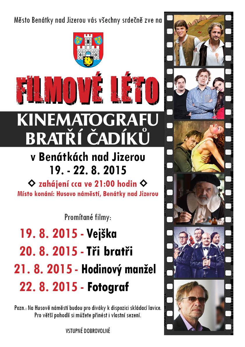 Město Benátky nad Jizerou připravuje Filmové léto Kinematografu bratří Čadíků a to ve dnech 19. - 22. 8. 2015 na Husově náměstí vždy od 21:00 hodin. Těšit se můžete na snímky "Vejška", "Tři bratři", "Hodinový manžel" a "Fotograf". Vstupné dobrovolné.