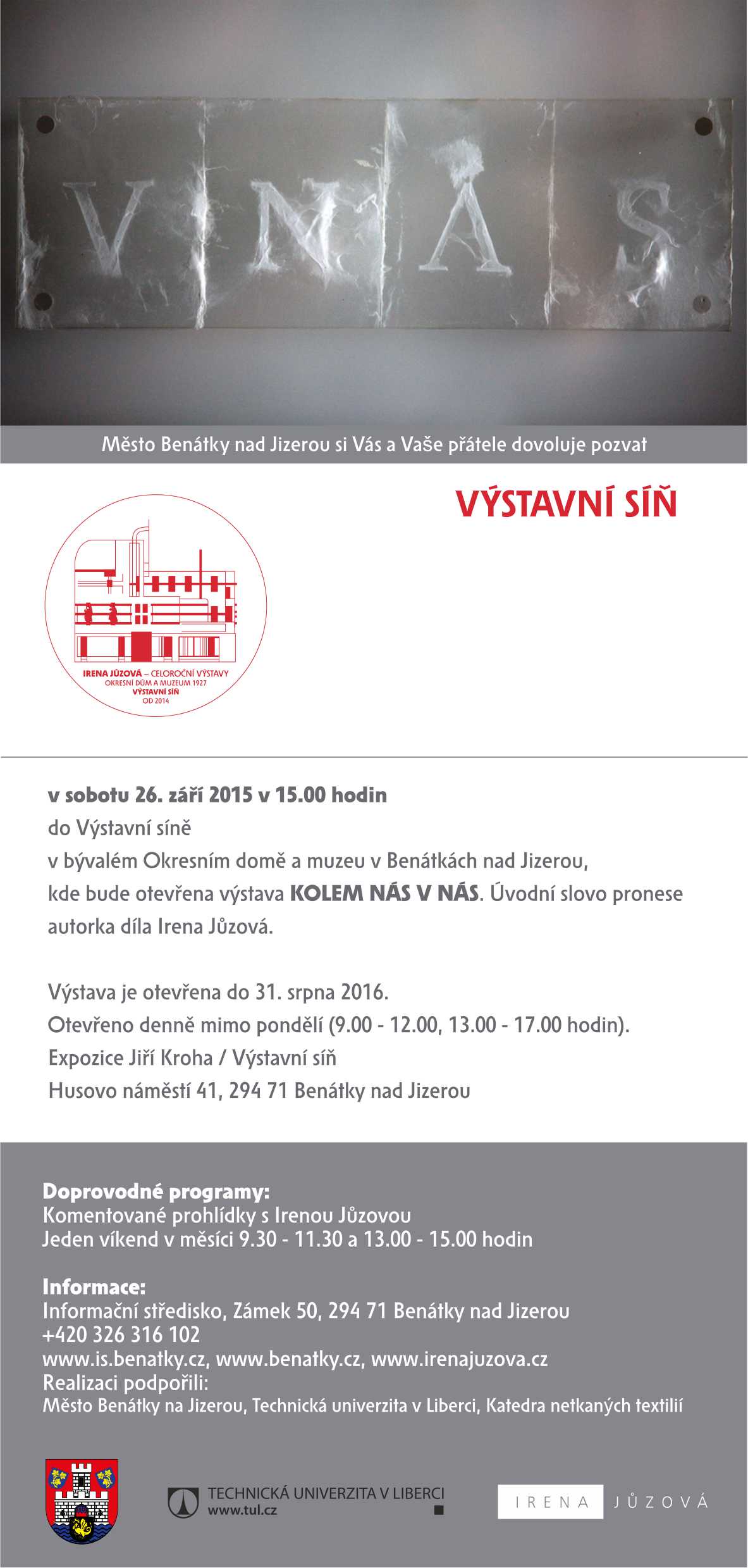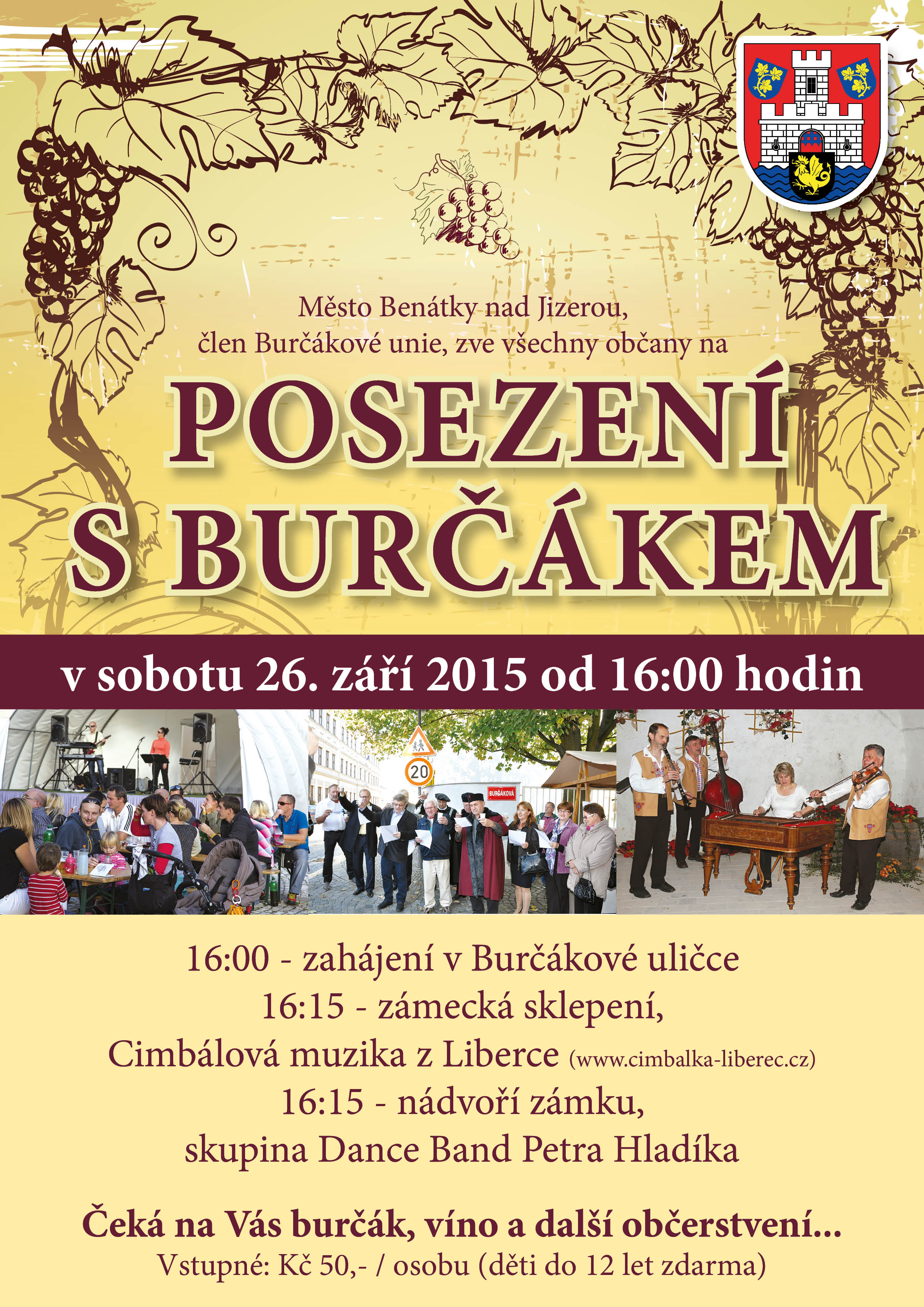 Město Benátky nad Jizerou, člen Burčákové unie, srdečně zve na POSEZENÍ S BURČÁKEM, které se uskuteční v sobotu 26. září 2015. Od 15:00 hodin se uskuteční VERNISÁŽ k nové celoroční výstavě Ireny Jůzové „Kolem nás v nás“ ve Výstavní síni, představující práci s nanovláknem a návštěvníkům bude k dispozici nové video mapující historii Husova náměstí, kterým je obohacena permanentní Expozice Jiřího Krohy na Husově náměstí v bývalém Okresním domě a muzeu (1927). Prohlídka pak bude možná do 17:00 hodin. Samotné slavnostní zahájení akce „Posezení s burčákem“ se uskuteční v 16:00 hodin v Burčákové uličce a program pak pokračuje v areálu zámku. Těšit se můžete na Cimbálovou muziku z Liberce a skupinu Dance Band Petra Hladíka. Čeká na vás burčák a víno z Hustopečí a další občerstvení.