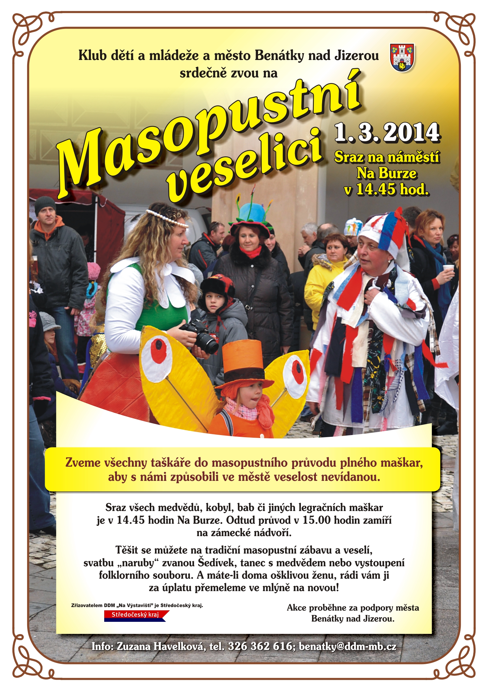 Klub dětí a mládeže a město Benátky nad Jizerou zve na MASOPUSTNÍ VESELICI, která se uskuteční v sobotu 1. března 2014. Sraz na náměstí Na Burse ve 14:45 hodin, odkud pak průvod v 15:00 hodin zamíří na zámecké nádvoří. Více informací naleznete v přiloze.