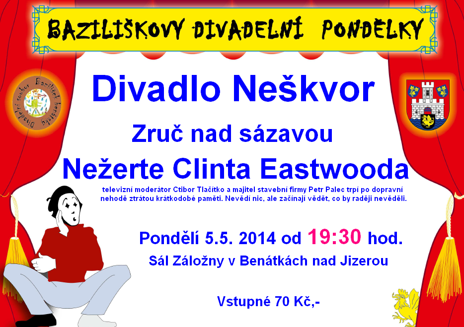 Divadelní spolek Bazilišek Benátský ve spolupráci s městem Benátky nad Jizerou srdečně zve na další představení Festivalu ochotnických divadel, které se uskuteční ve velkém sále Záložny v pondělí 5. května 2014 od 19:30 hodin. Prodej vstupenek na místě. Vstupné Kč 70,-. Tentokrát se představí Divadlo Neškvor s divadelní hrou "Nežerte Clinta Eastwooda".