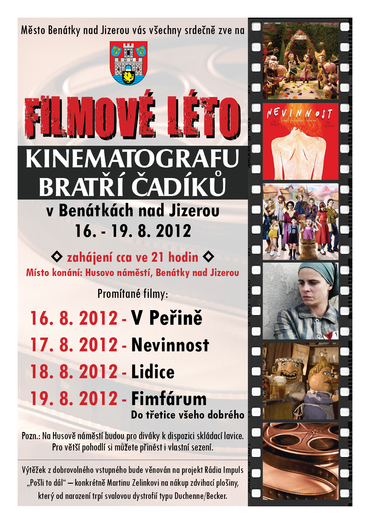 Město Benátky nad Jizerou připravuje Filmové léto Kinematografu bratří Čadíků. 16. - 19. 8. 2012 vždy od 21:00 hodin na Husově náměstí.