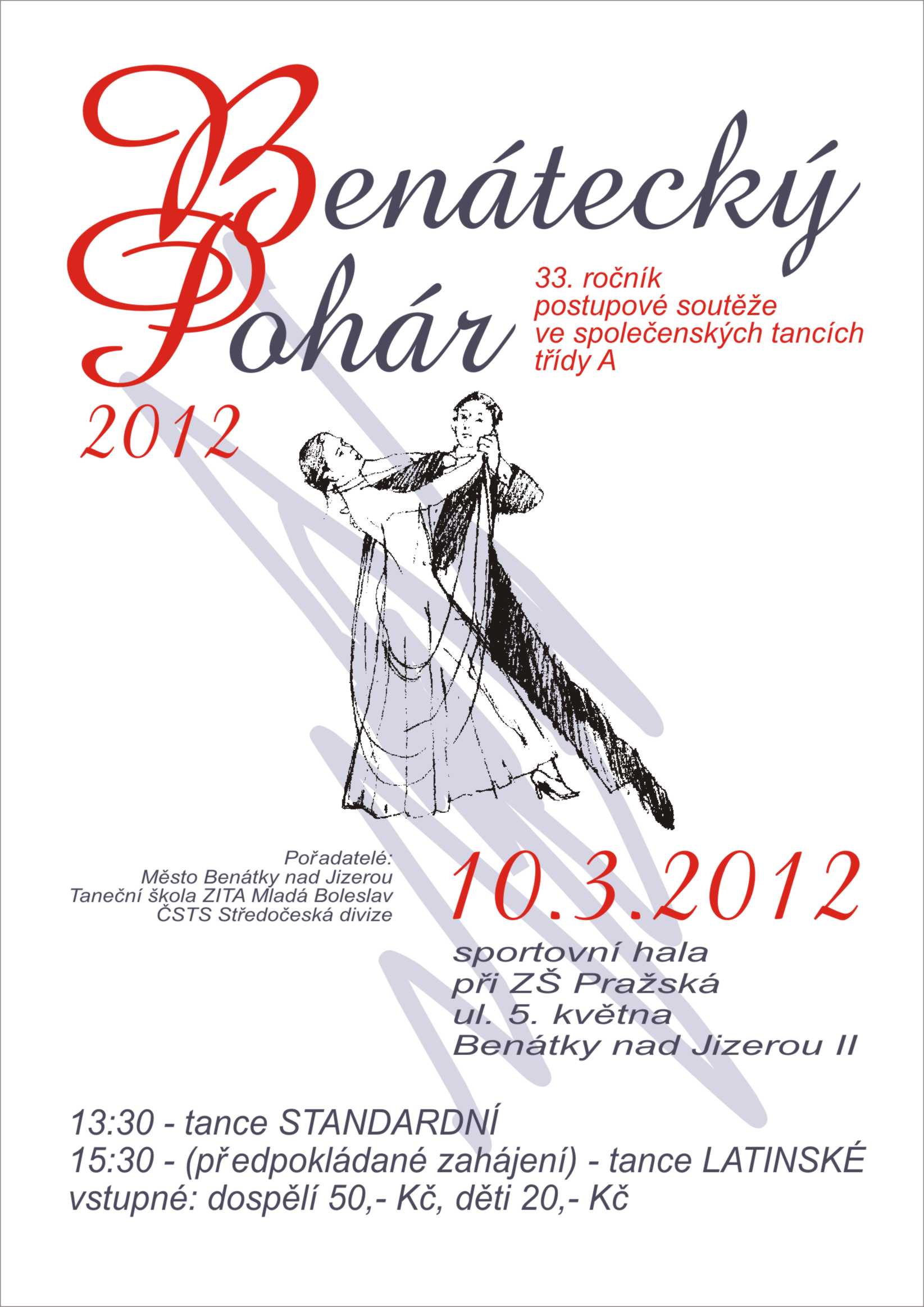 Město Benátky nad Jizerou srdečně zve všechny občany na 33. ročník BENÁTECKÉHO POHÁRU - postupovou soutěž ve společenských tancích třídy A. V sobotu 10. 3. 2012 od 13:30 hodin do sportovní haly při ZŠ Pražská! Od 13:30 hodin zahájení standardních tanců, předpokládané zahájení tanců latinských cca od 15:30 hodin.