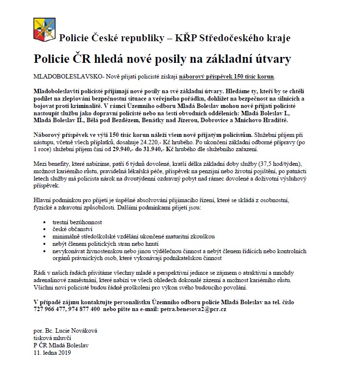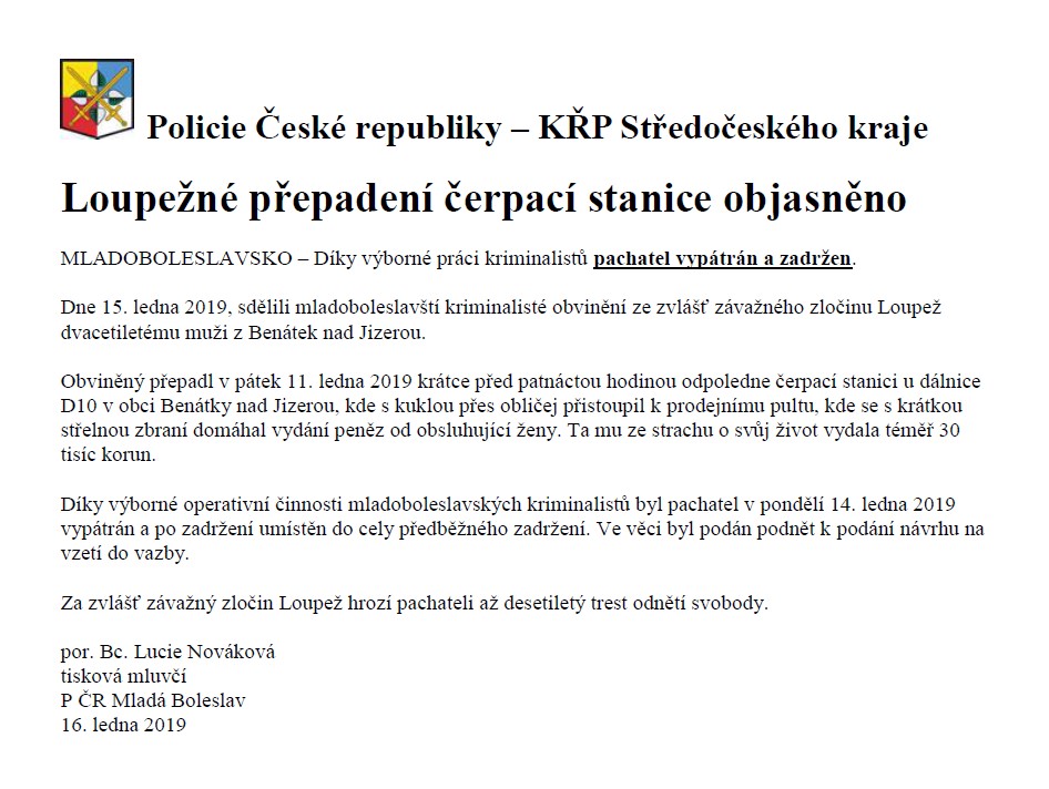 Dne 11. ledna 2019 došlo k přepadení čerpací stanice u dálnice v Benátkách nad Jizerou. Díky výborné práci kriminalistů byl pachatel vypátrán a zadržen. Více informací naleznete ZDE.