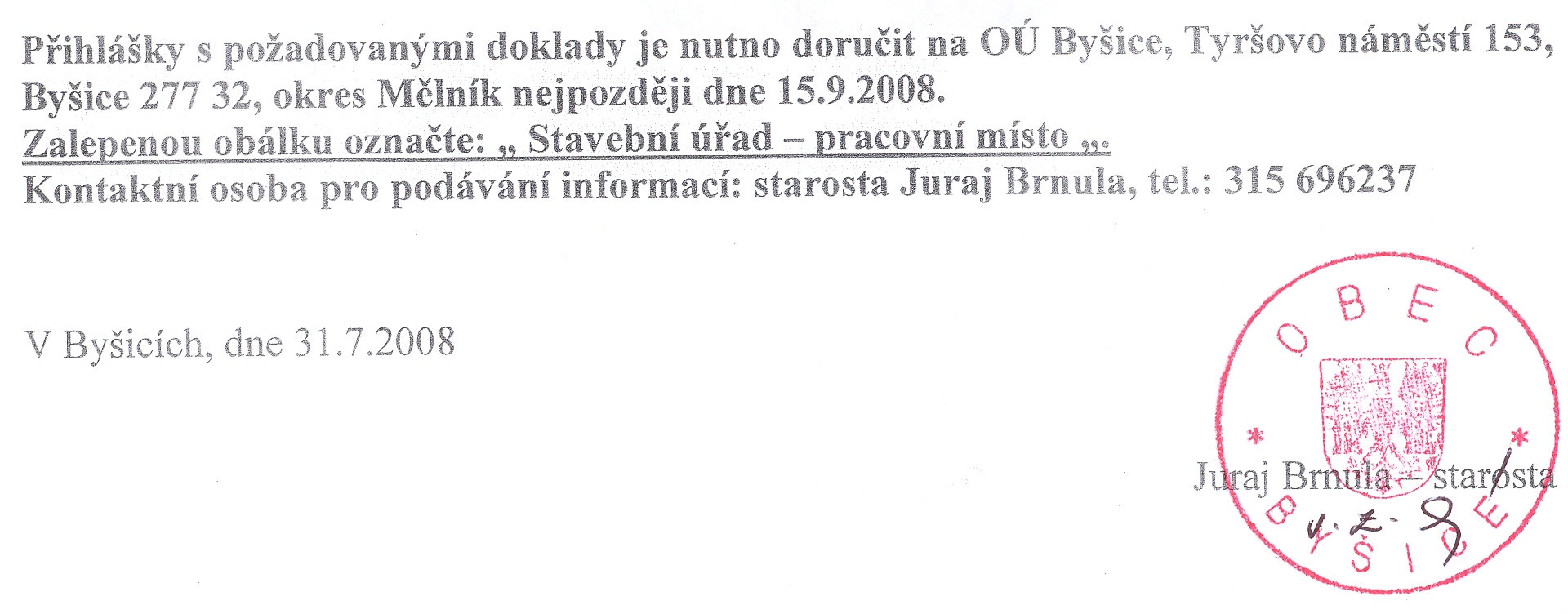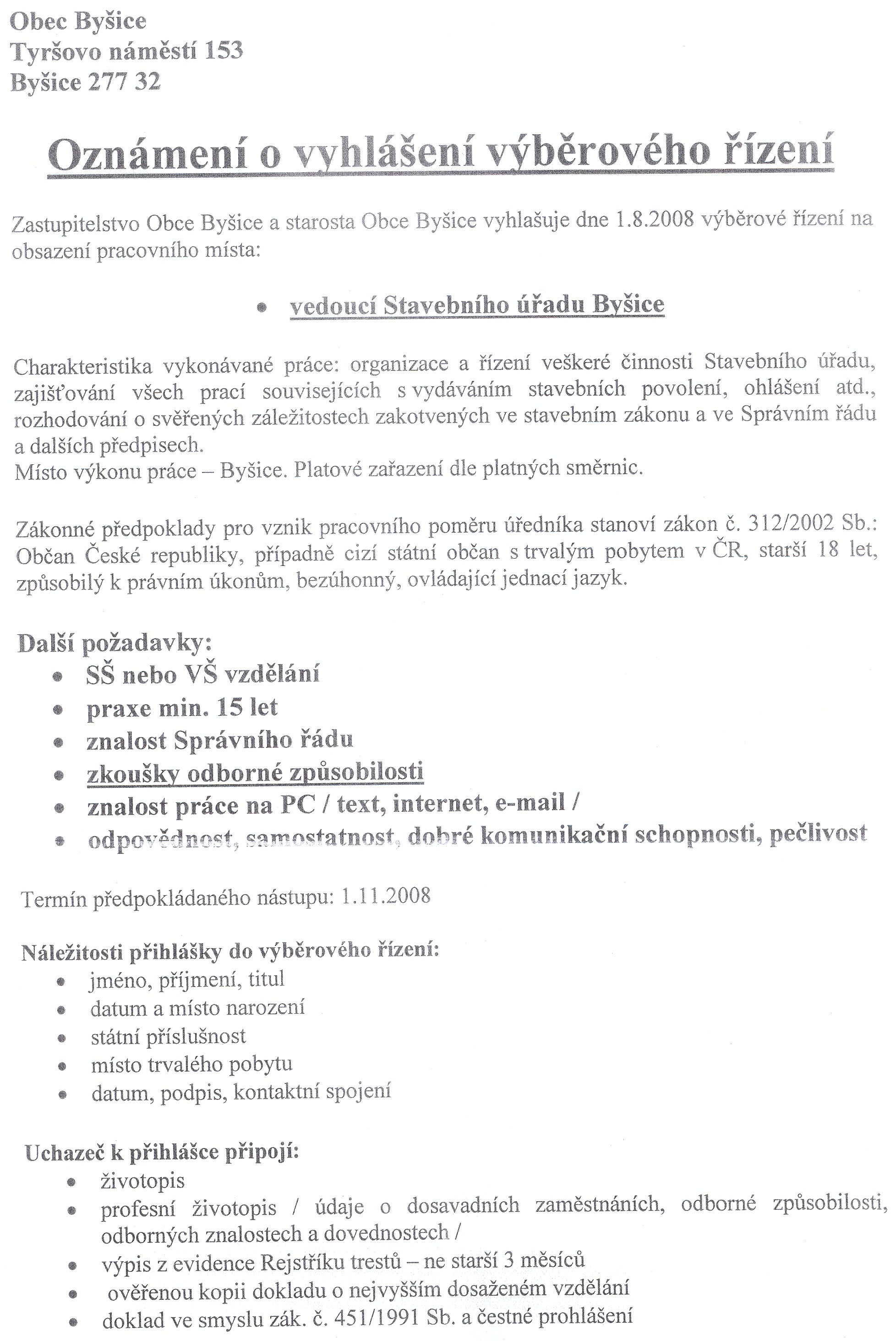 Obec Byšice, Tyršovo náměstí 153, 277 32 Byšice Výběrové řízení