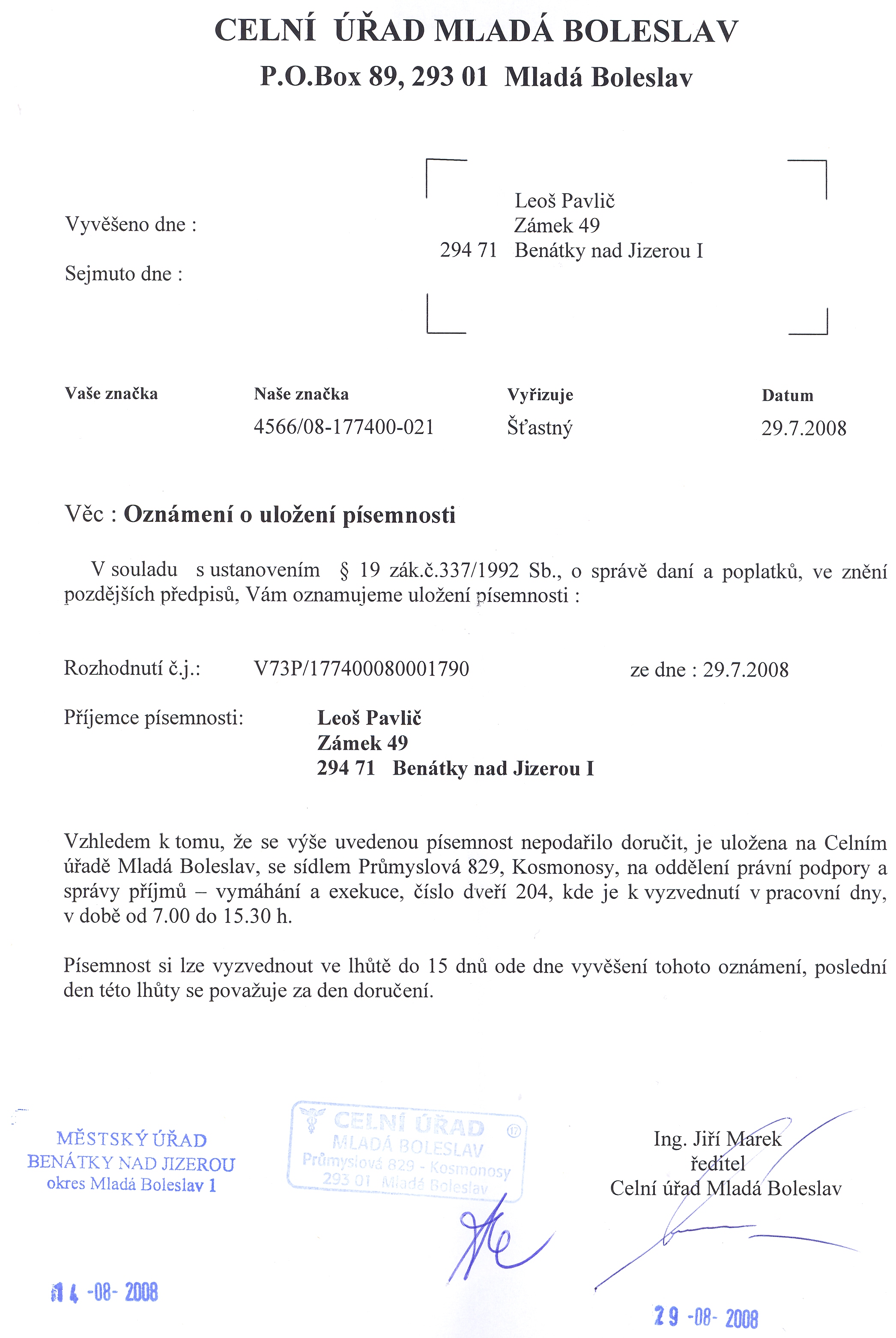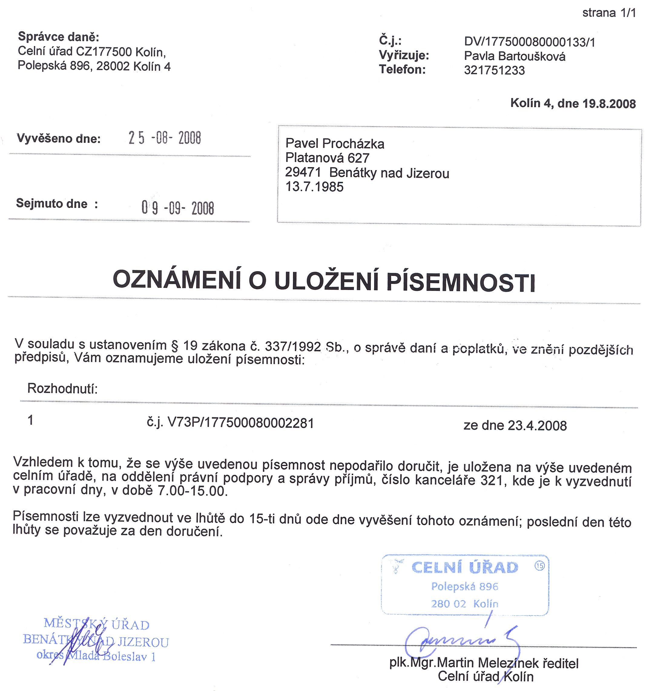Celní úřad Mladá Boleslav, P.O. Box 89, 293 01 Mladá Boleslav Oznámení o uložení písemnosti