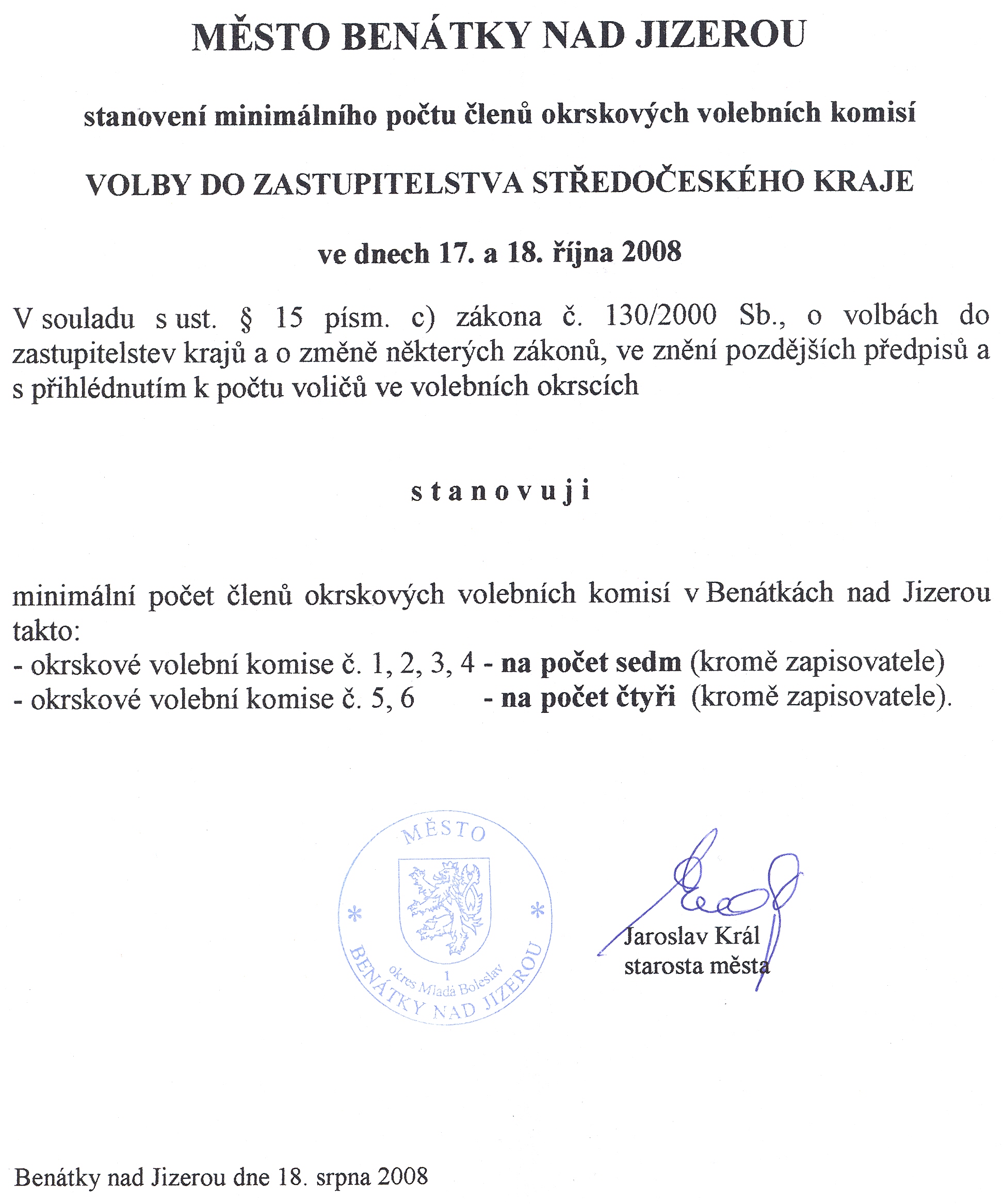 Město Benátky nad Jizerou, Zámek 49, 294 71 Benátky nad Jizerou Volby do Zastupitelstva středočeského kraje
