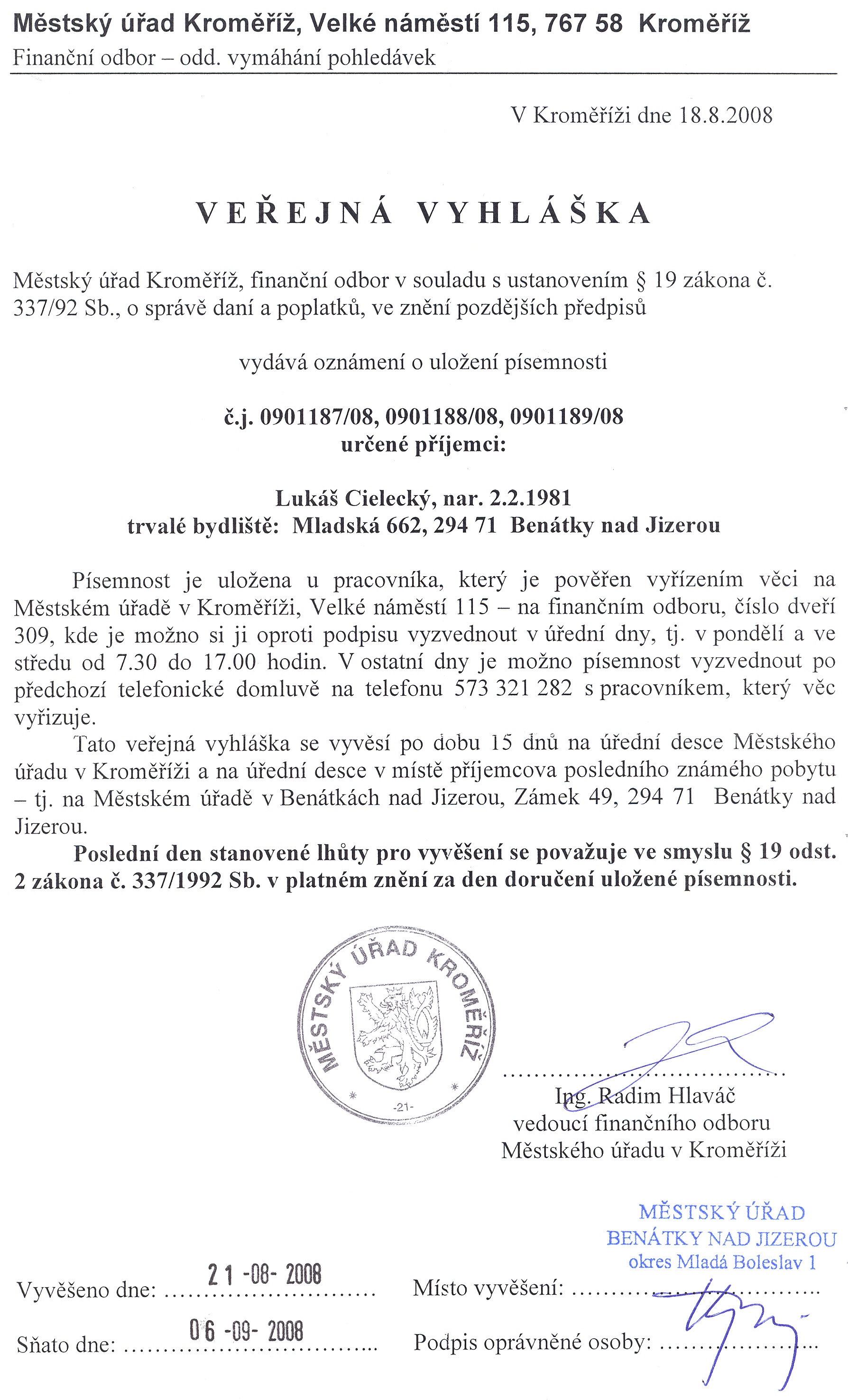 Vyvěšení: 25.8.2008 Sejmutí: 09.9.2008