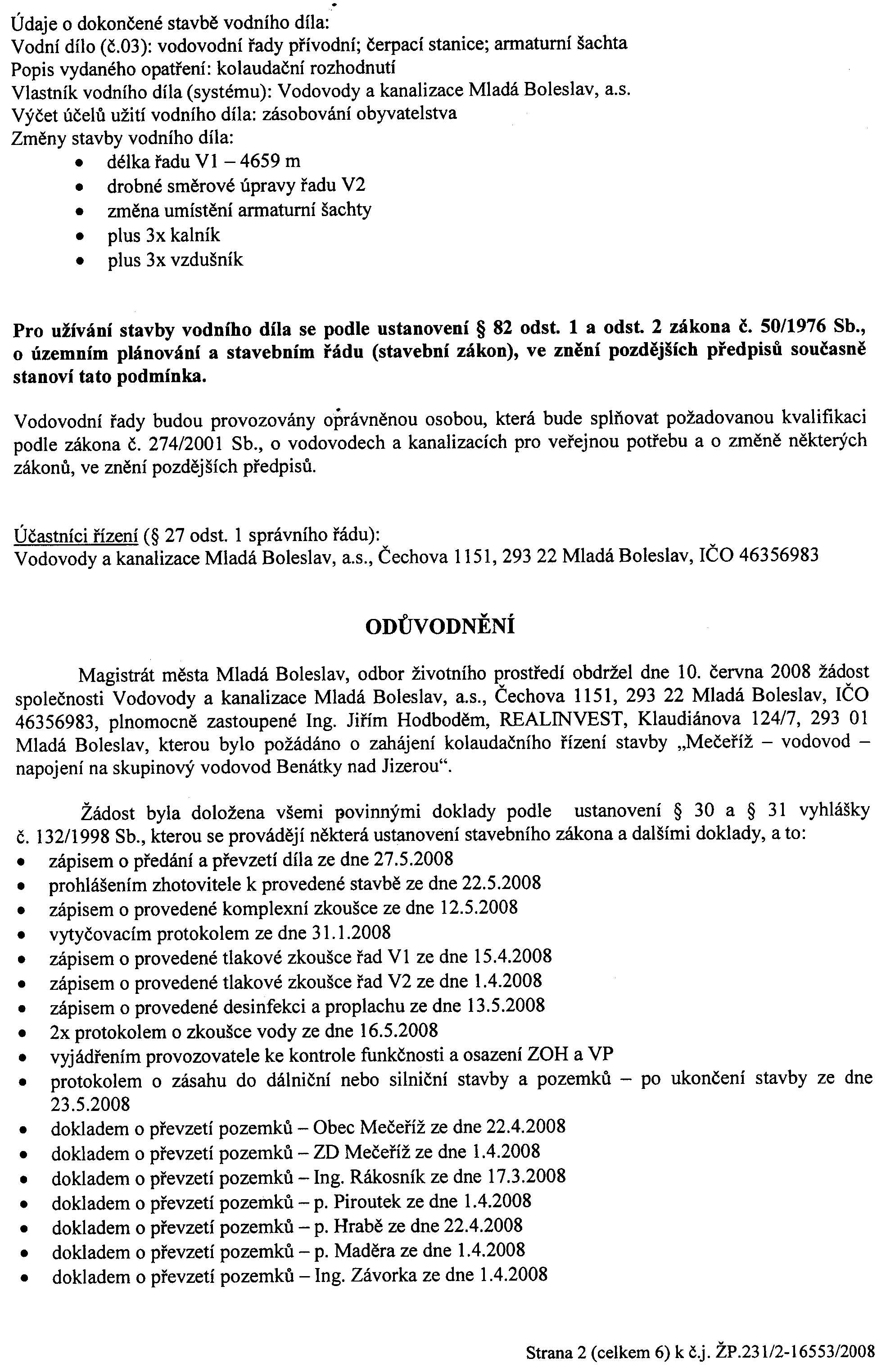 Magistrát města Mladá Boleslav, odbor životního prostředí, Komenského náměstí 61, 293 49 Mladá Boleslav Kolaudační rozhodnutí