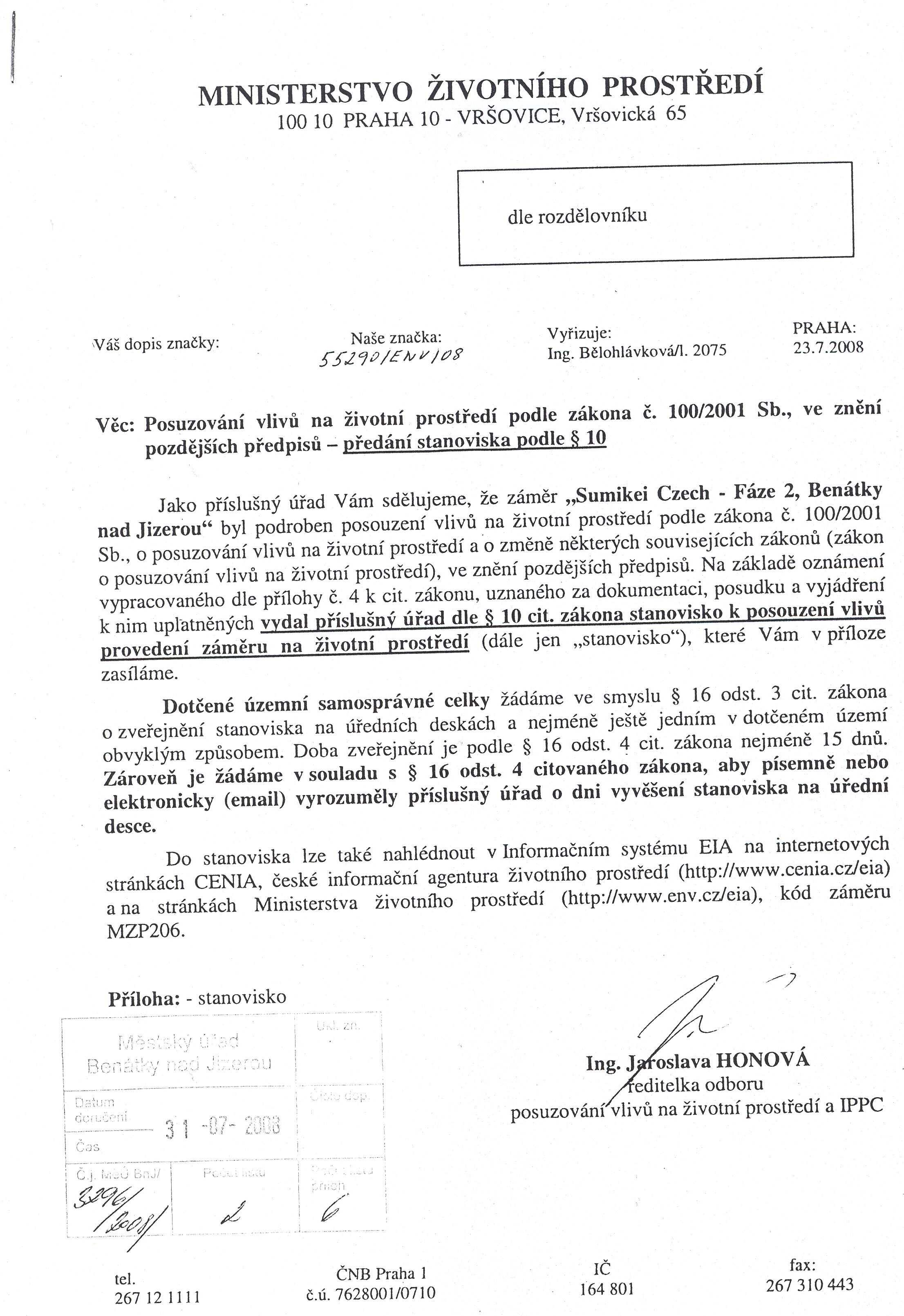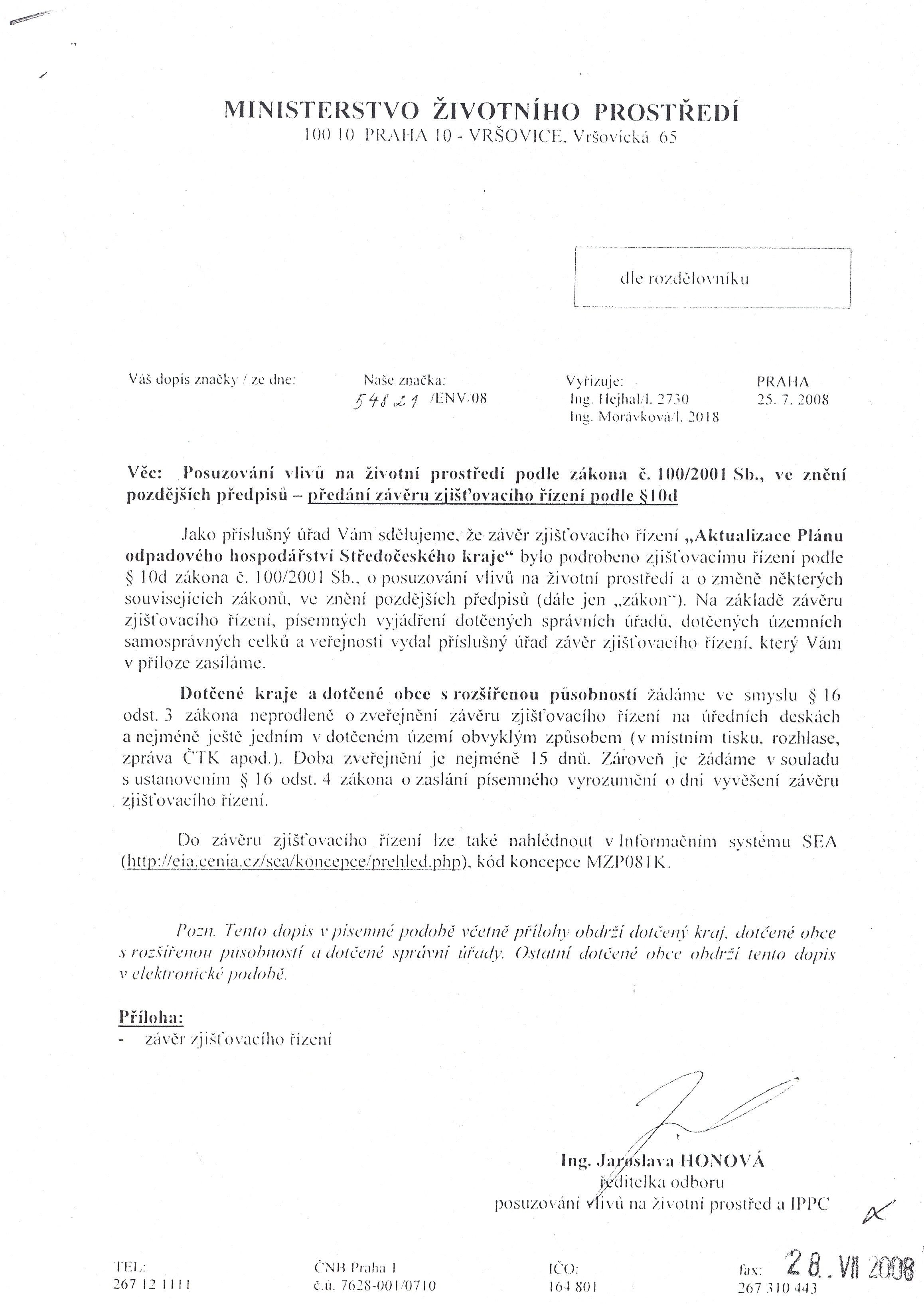 Ministerstvo životního prostředí, Vršovická 65, 100 10 Praha 10-Vršovice Posuzování vlivů na životní prostředí podle zákona č. 100/2001 Sb., ve znění pozdějších předpisů - předání závěru zjišťovacího řízení podle § 10d