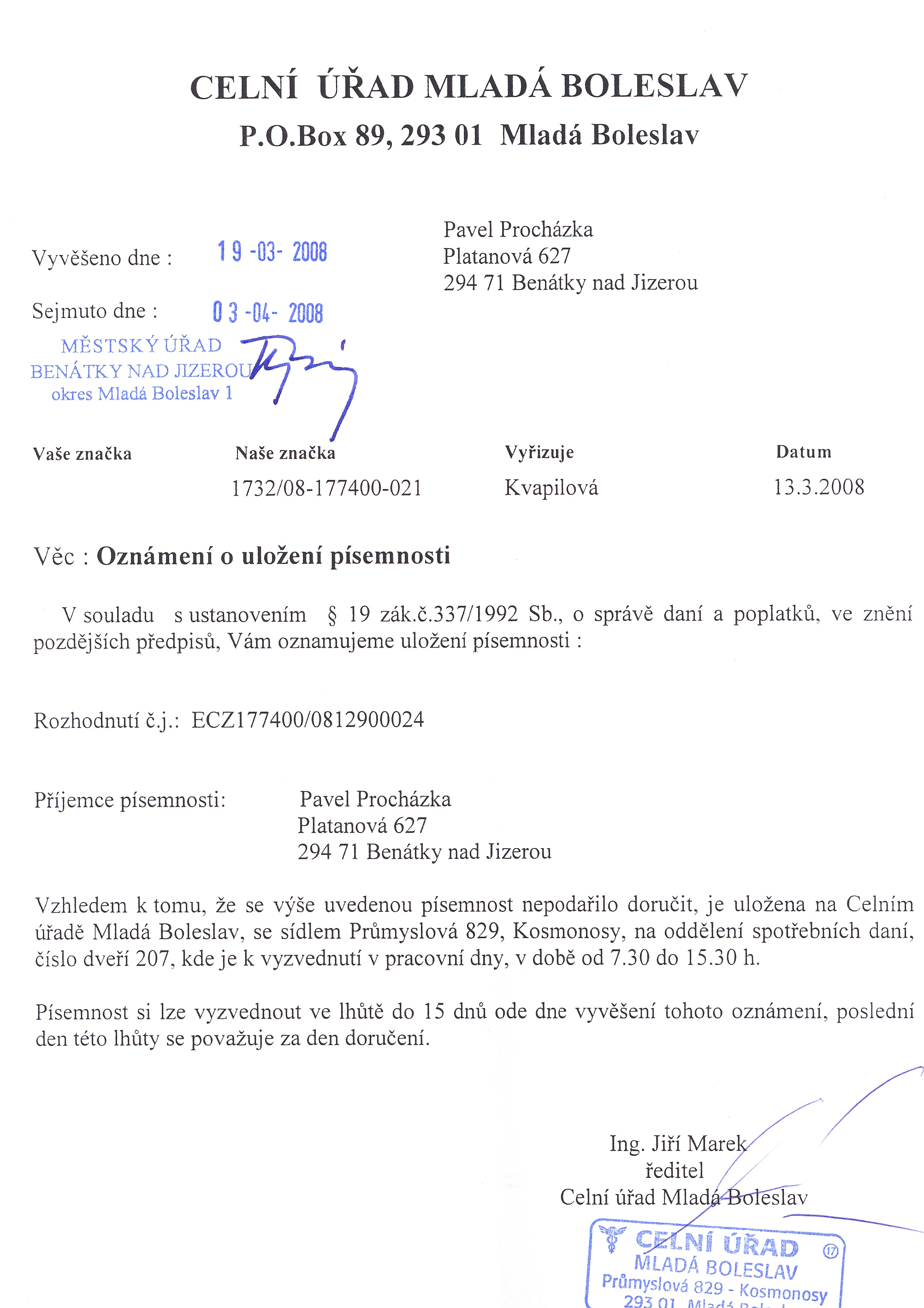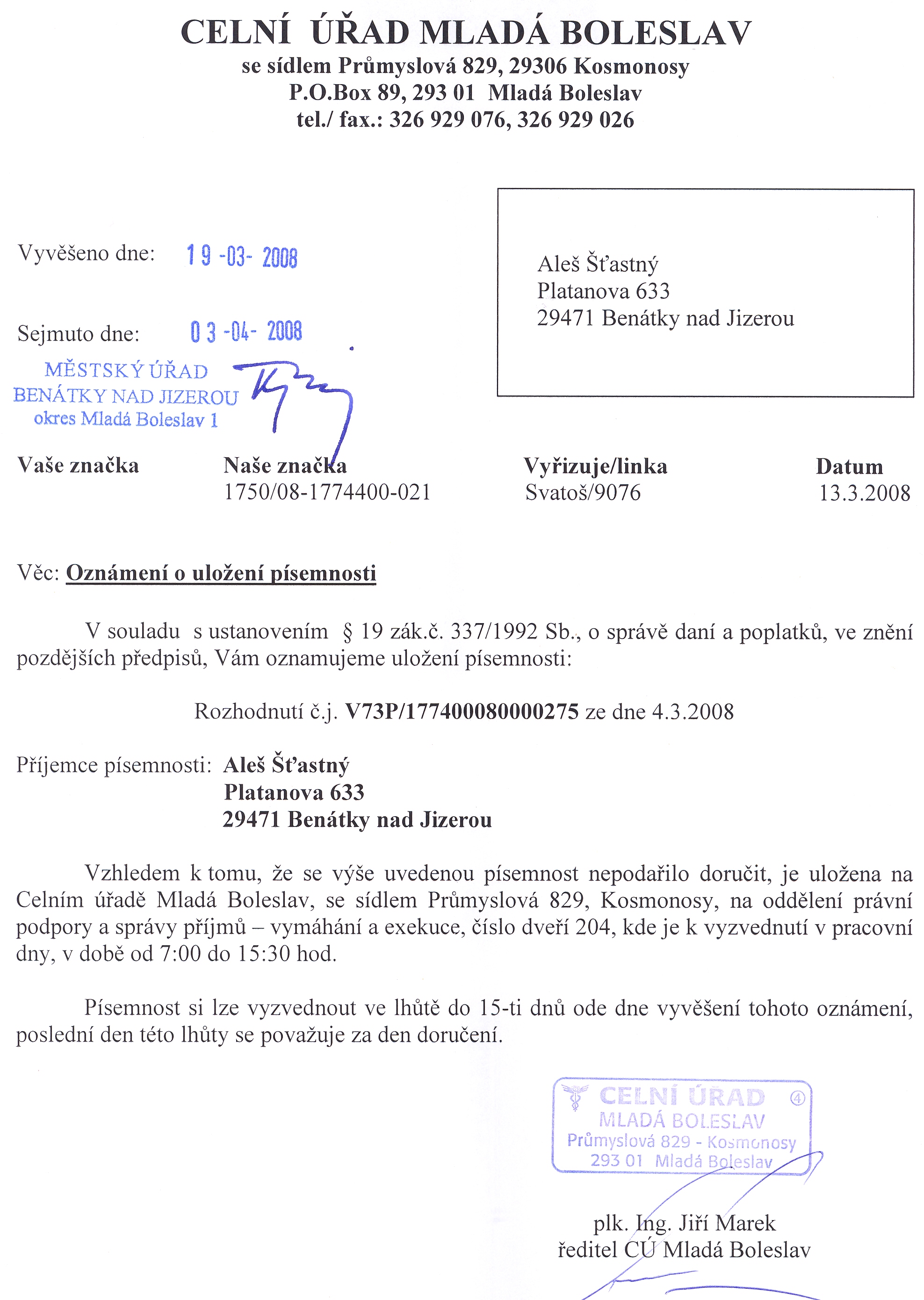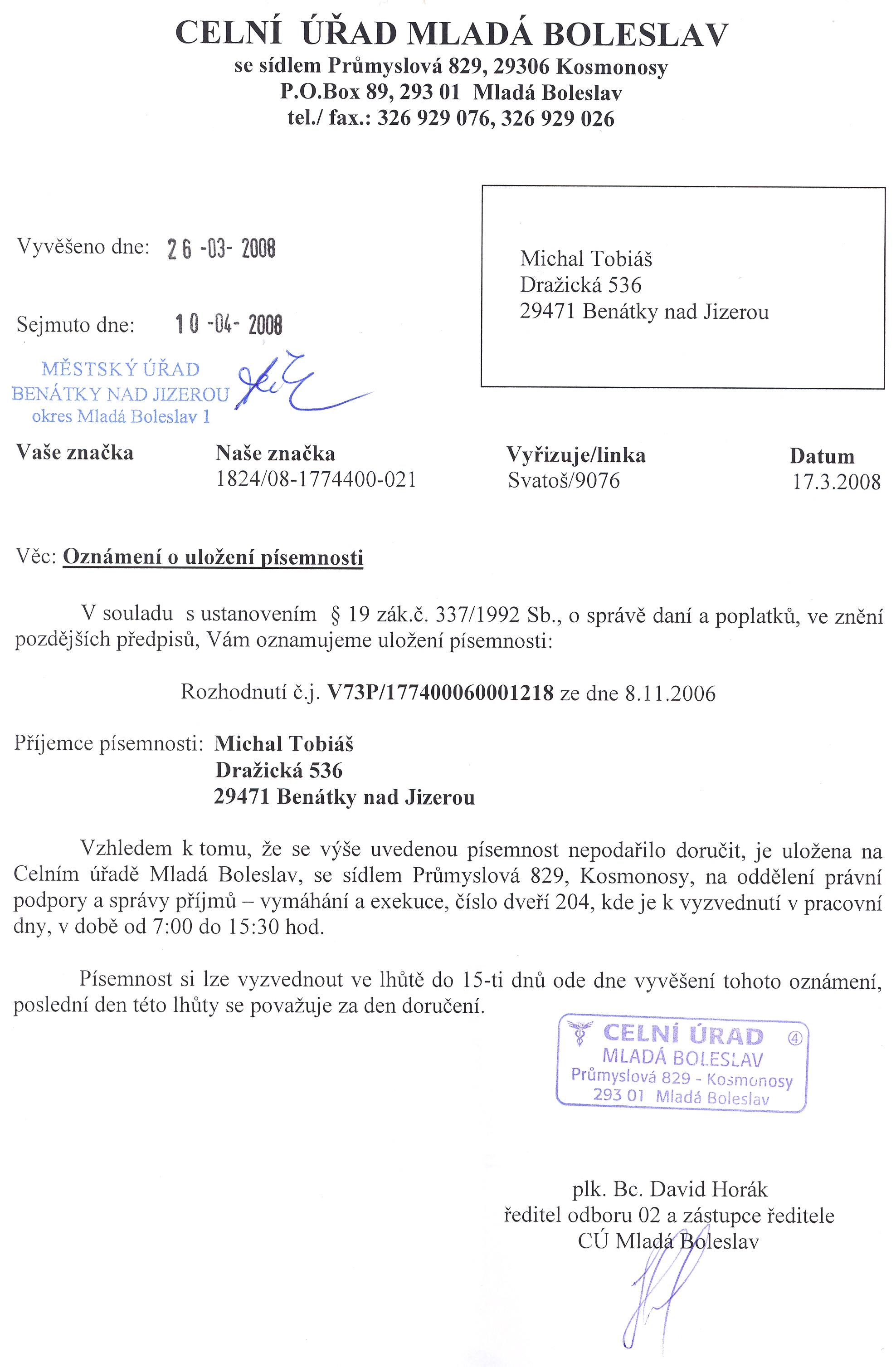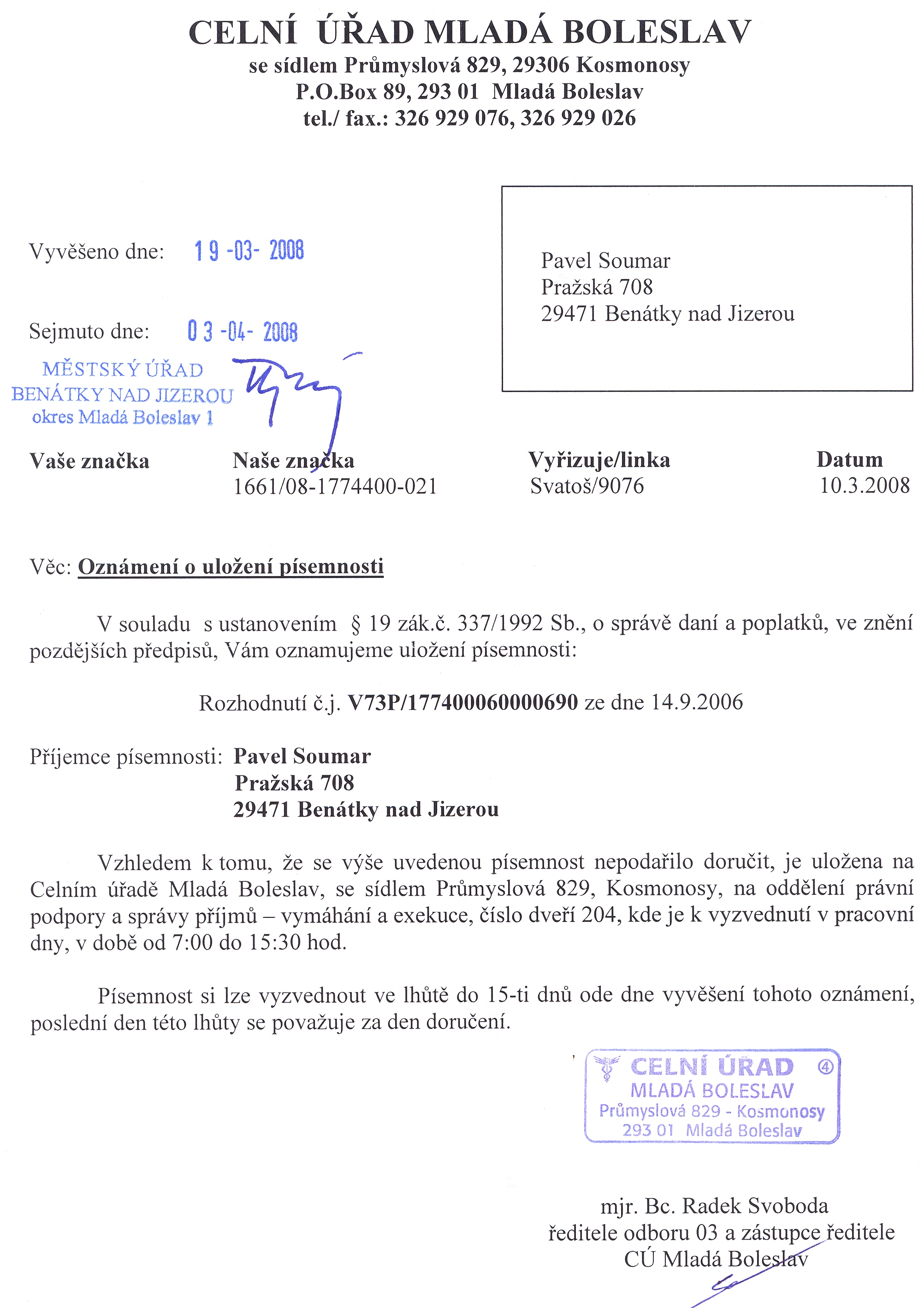 Celní úřad Mladá Boleslav, Průmyslová 829, 293 06 Kosmonosy Oznámení o uložení písemnosti