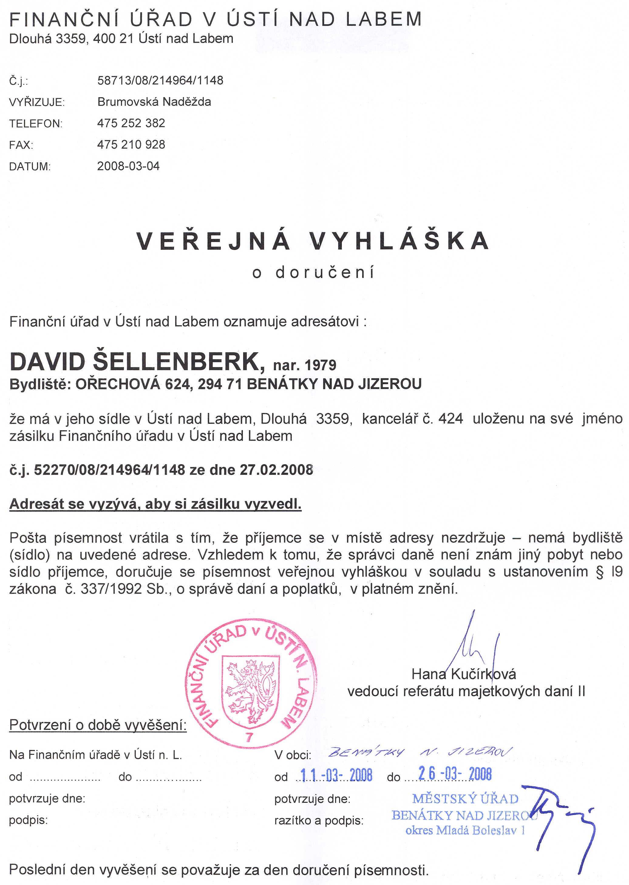 Finanční úřad v Ústí nad Labem, Dlouhá 3359, 400 21 Ústí nad Labem Oznámení o doručení písemnosti