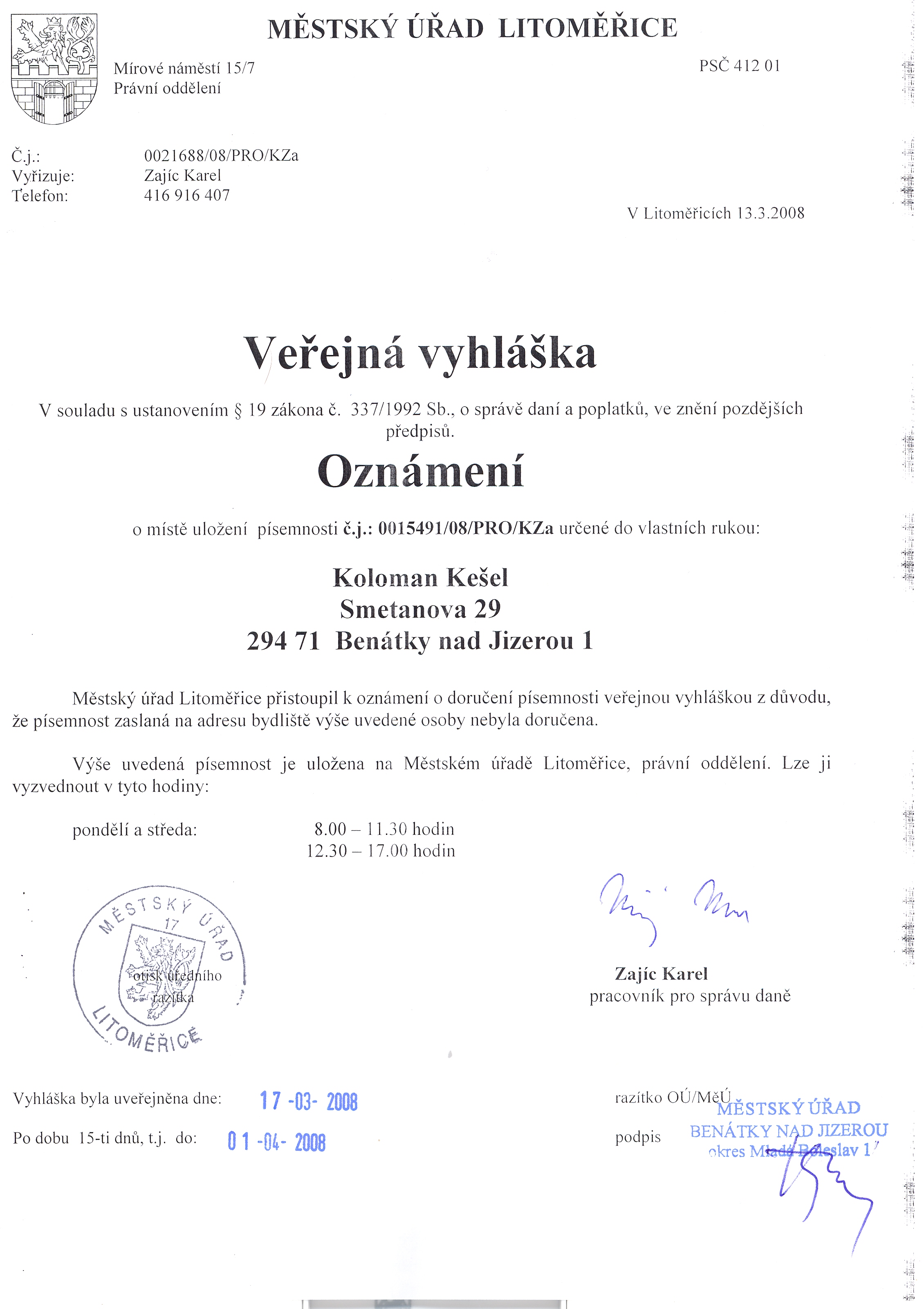 Městský úřad Litoměřice, Mírové náměstí 15/7, právní oddělení, 412 01 Litoměřice Oznámení o doručení písemnosti