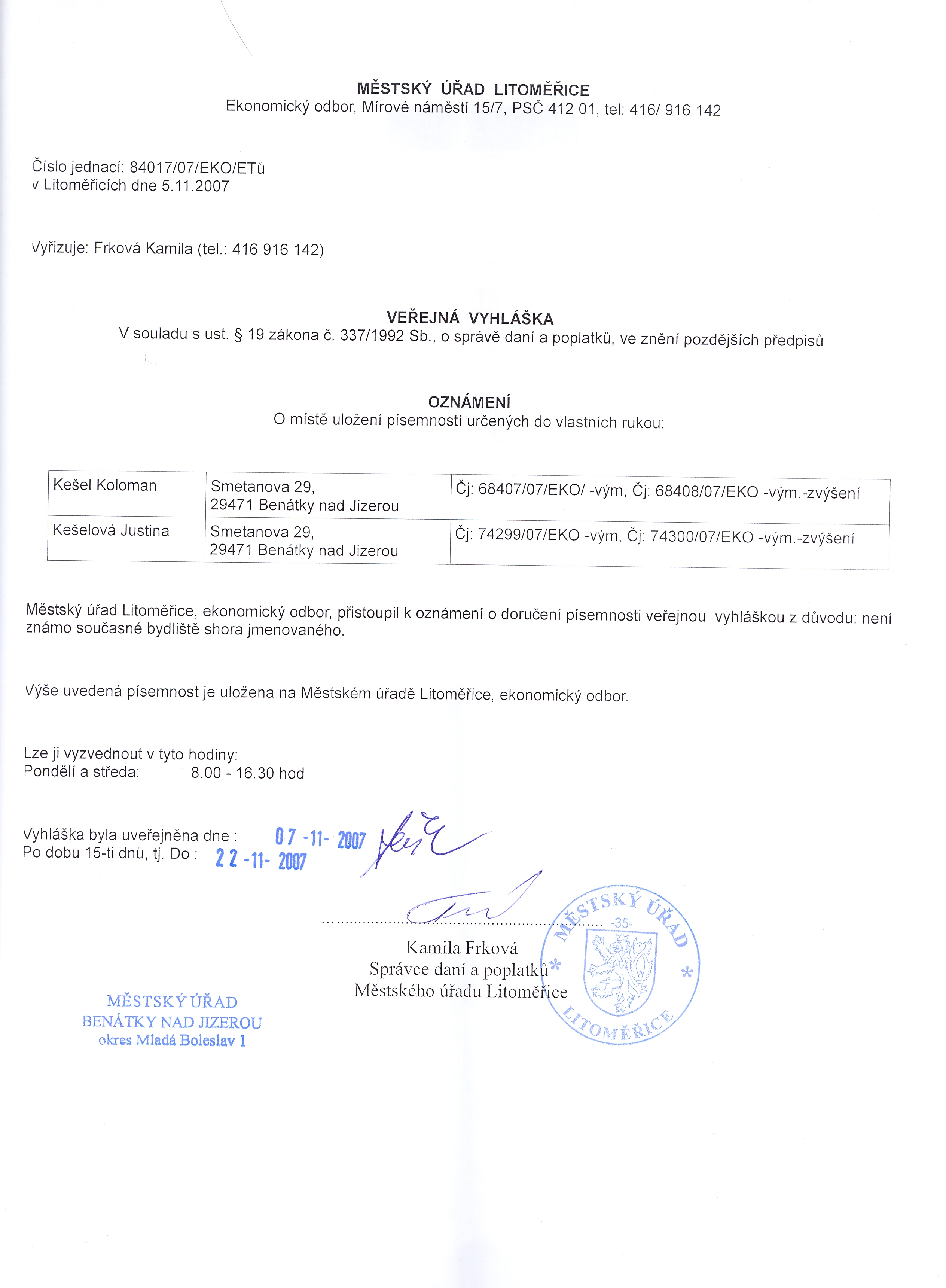 Městský úřad Litoměřice, Mírové náměstí 15/7, 412 01 Litoměřice Oznámení o uložení písemností