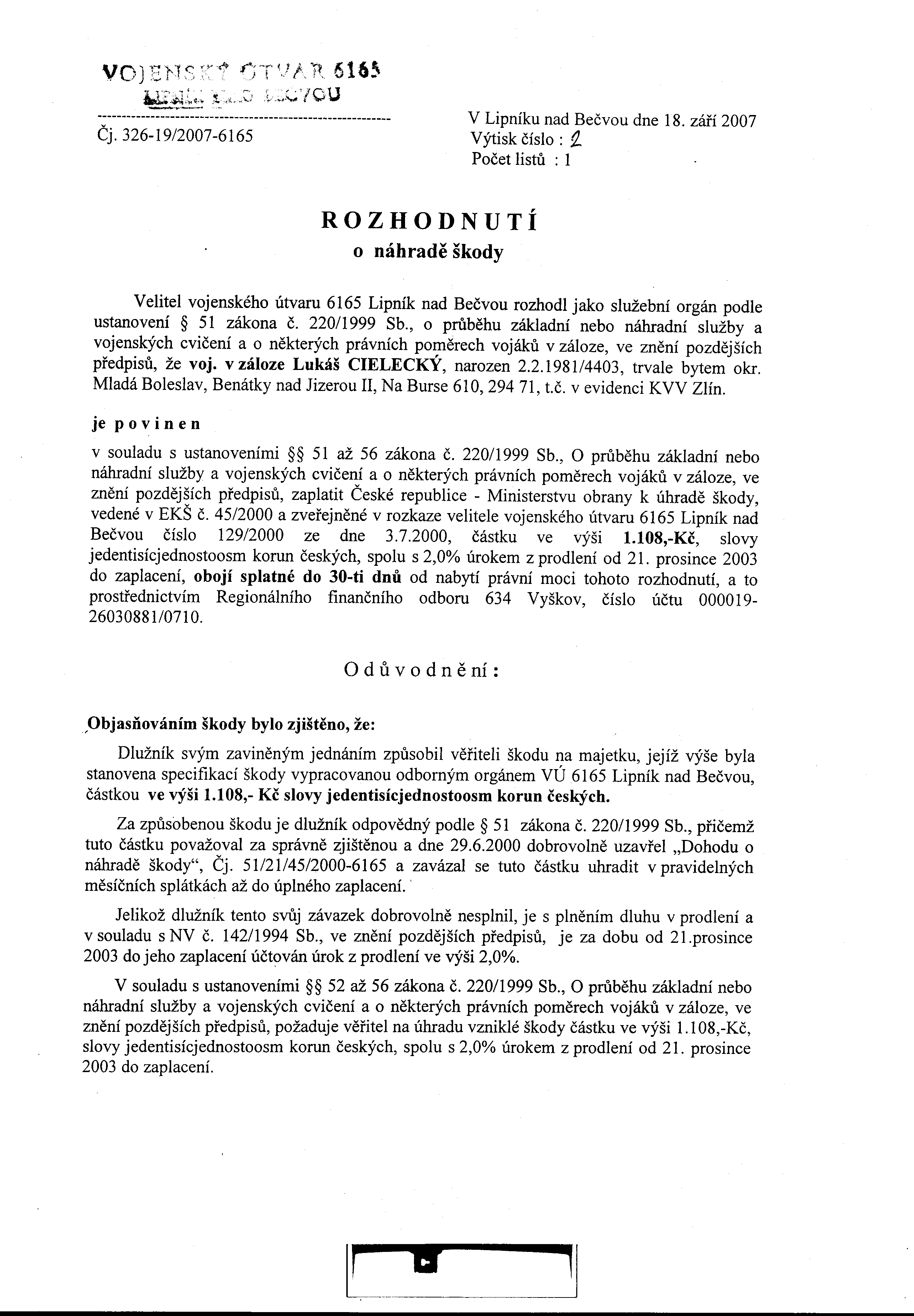 Vojenský útvar 6165, 751 31 Lipník nad Bečvou Rozhodnutní o náhradě škody
