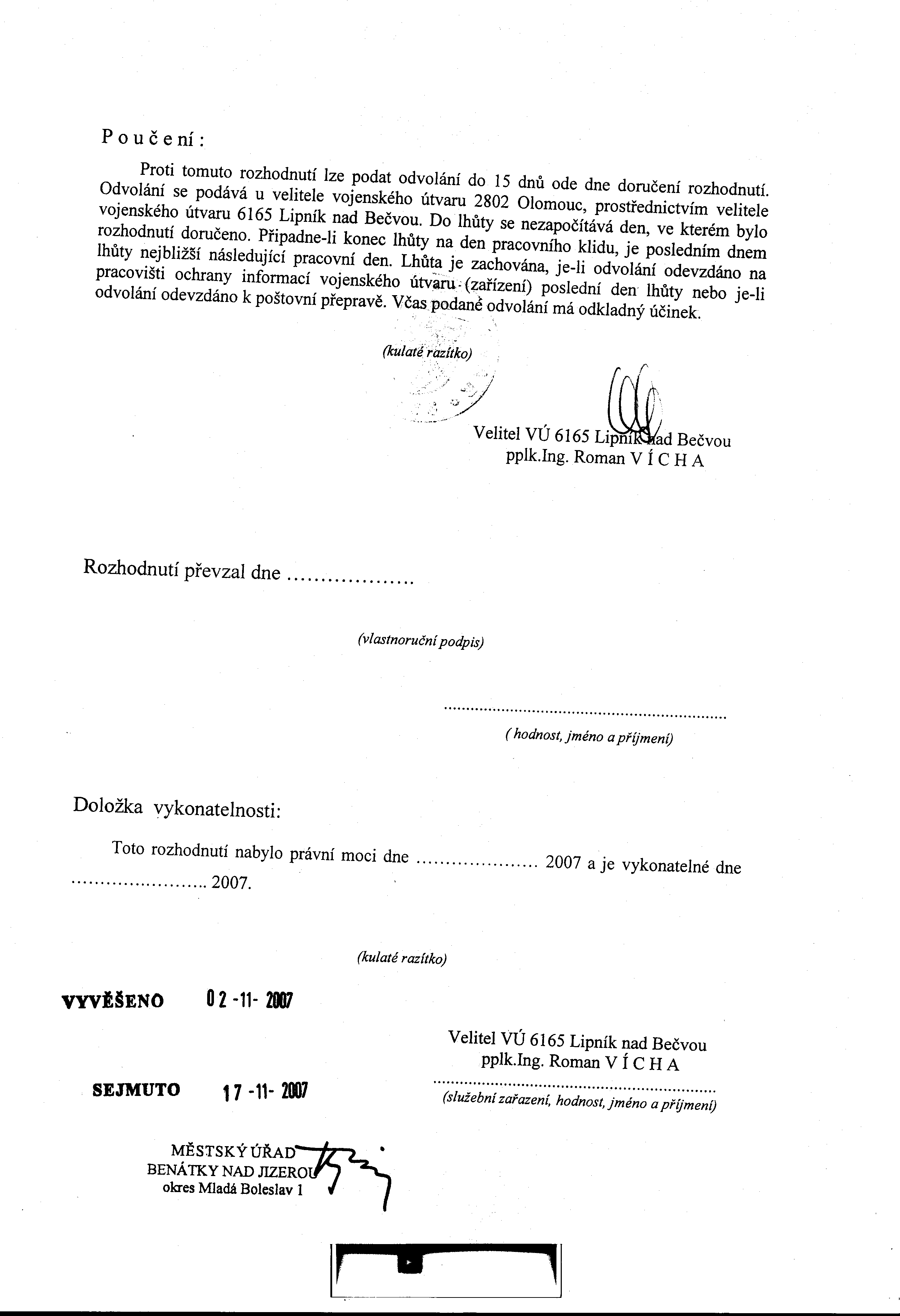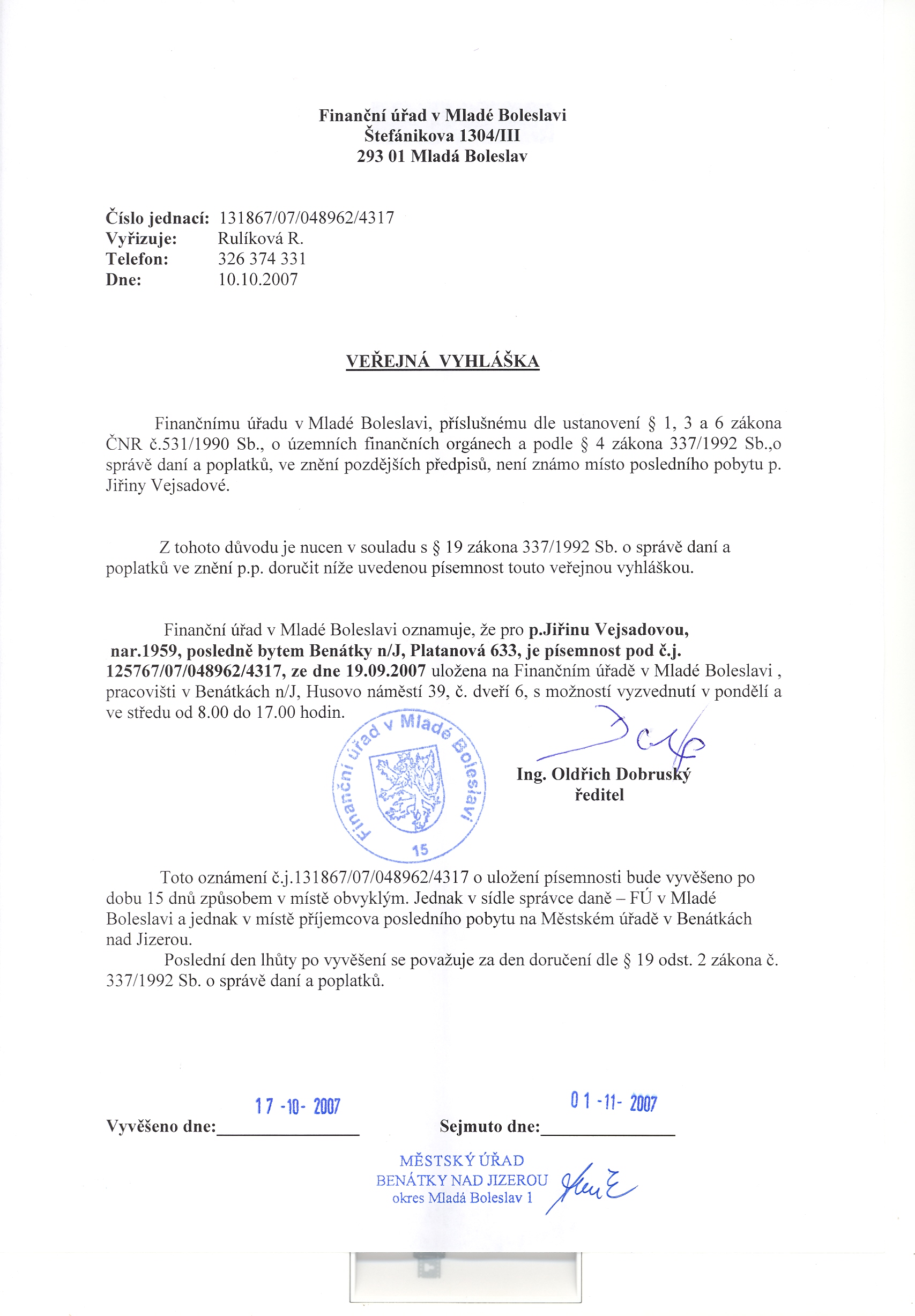 Vyvěšení: 17.10.2007 Sejmutí: 01.11.2007