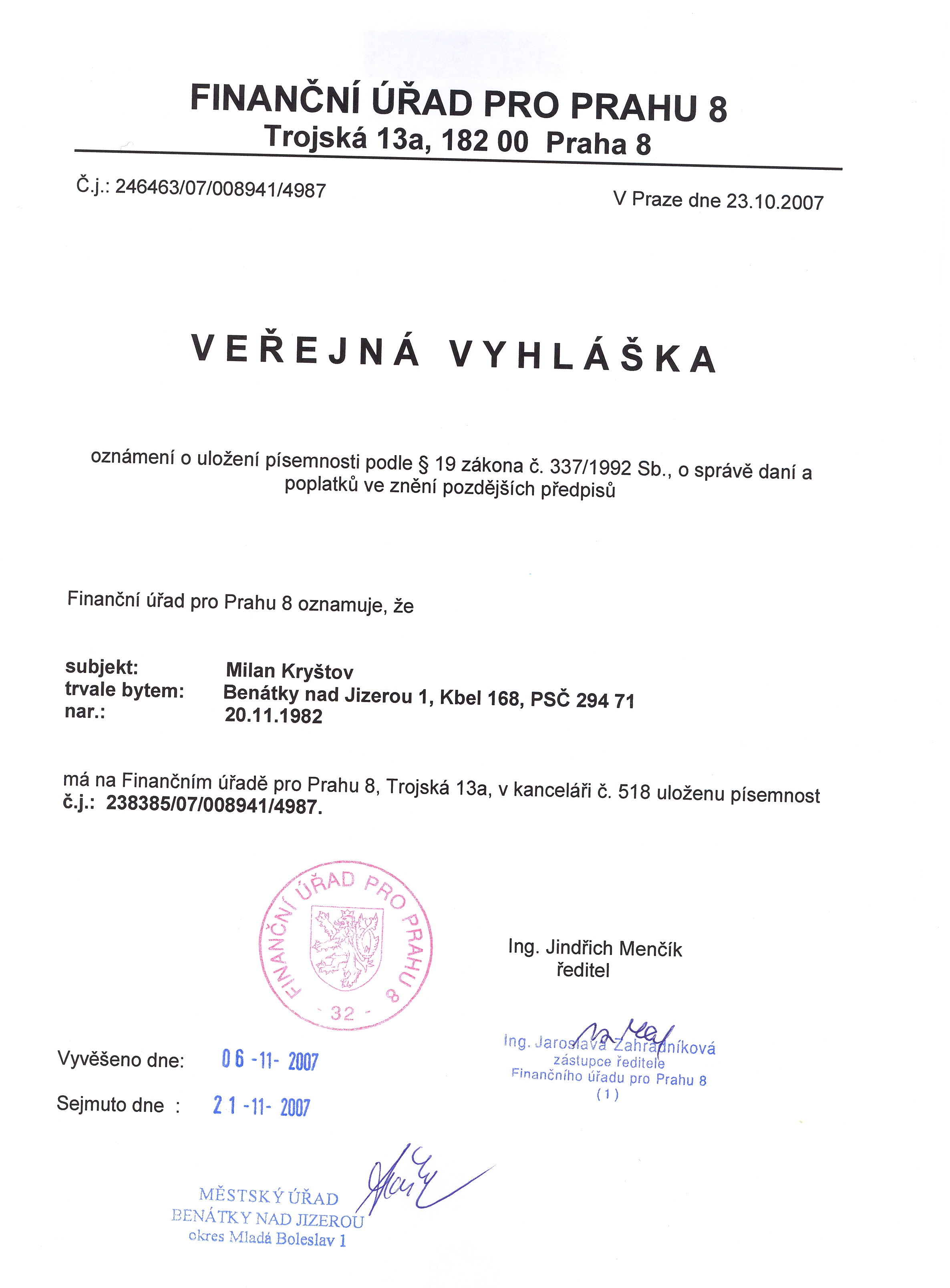 Vyvěšení: 02.11.2007 Sejmutí: 17.11.2007