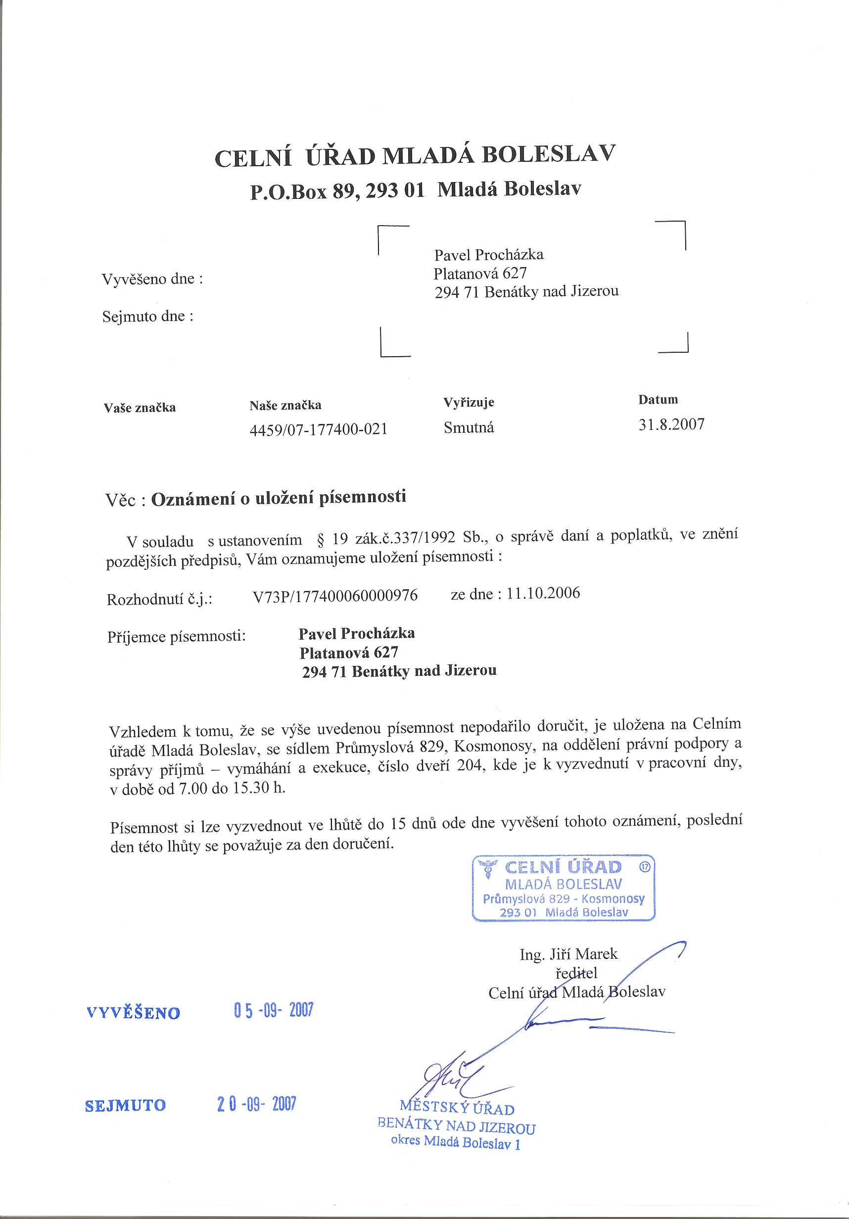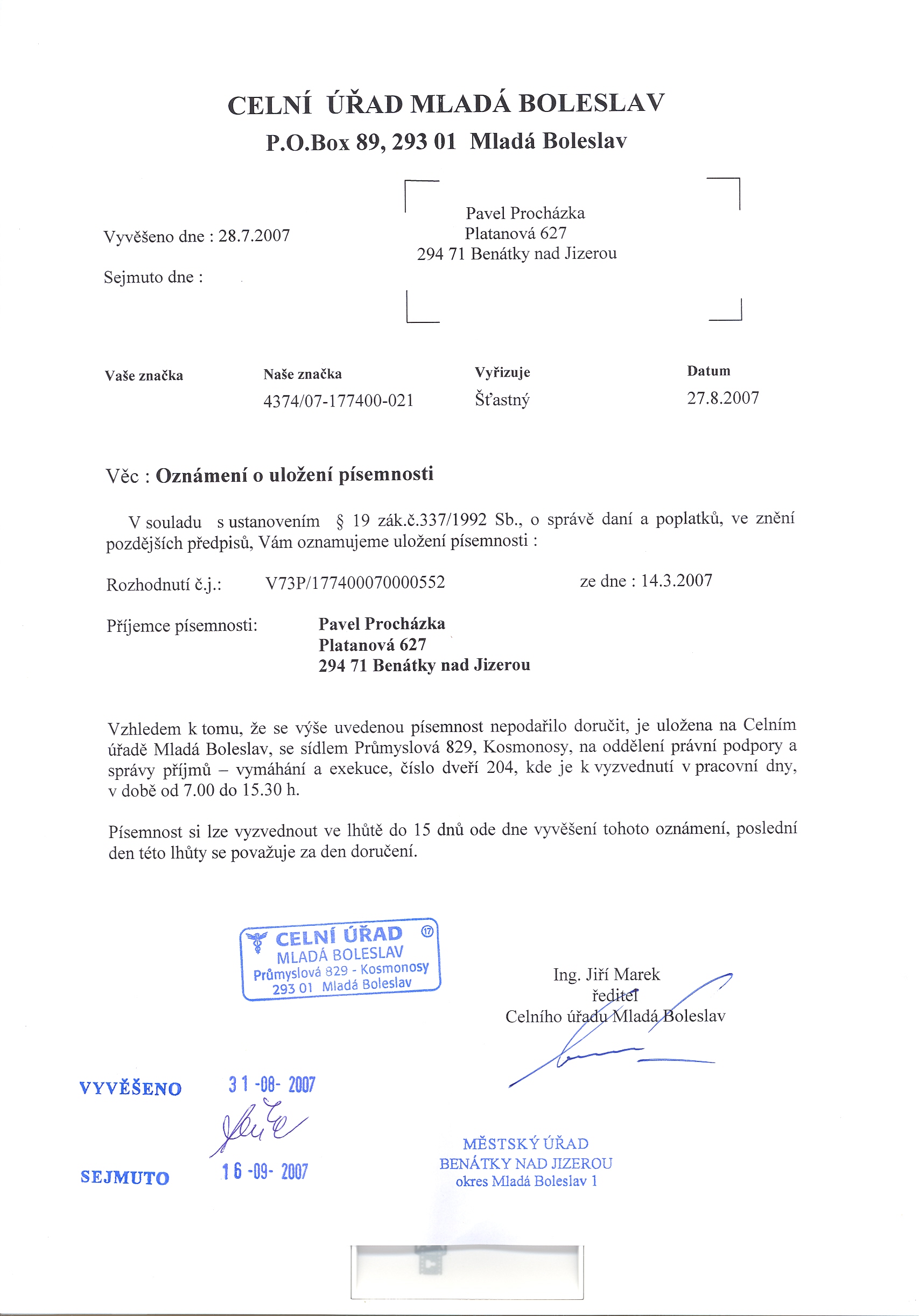 Celní úřad Mladá Boleslav, P.O.Box 89, 293 01 Mladá Boleslav Oznámení o uložení písemnosti
