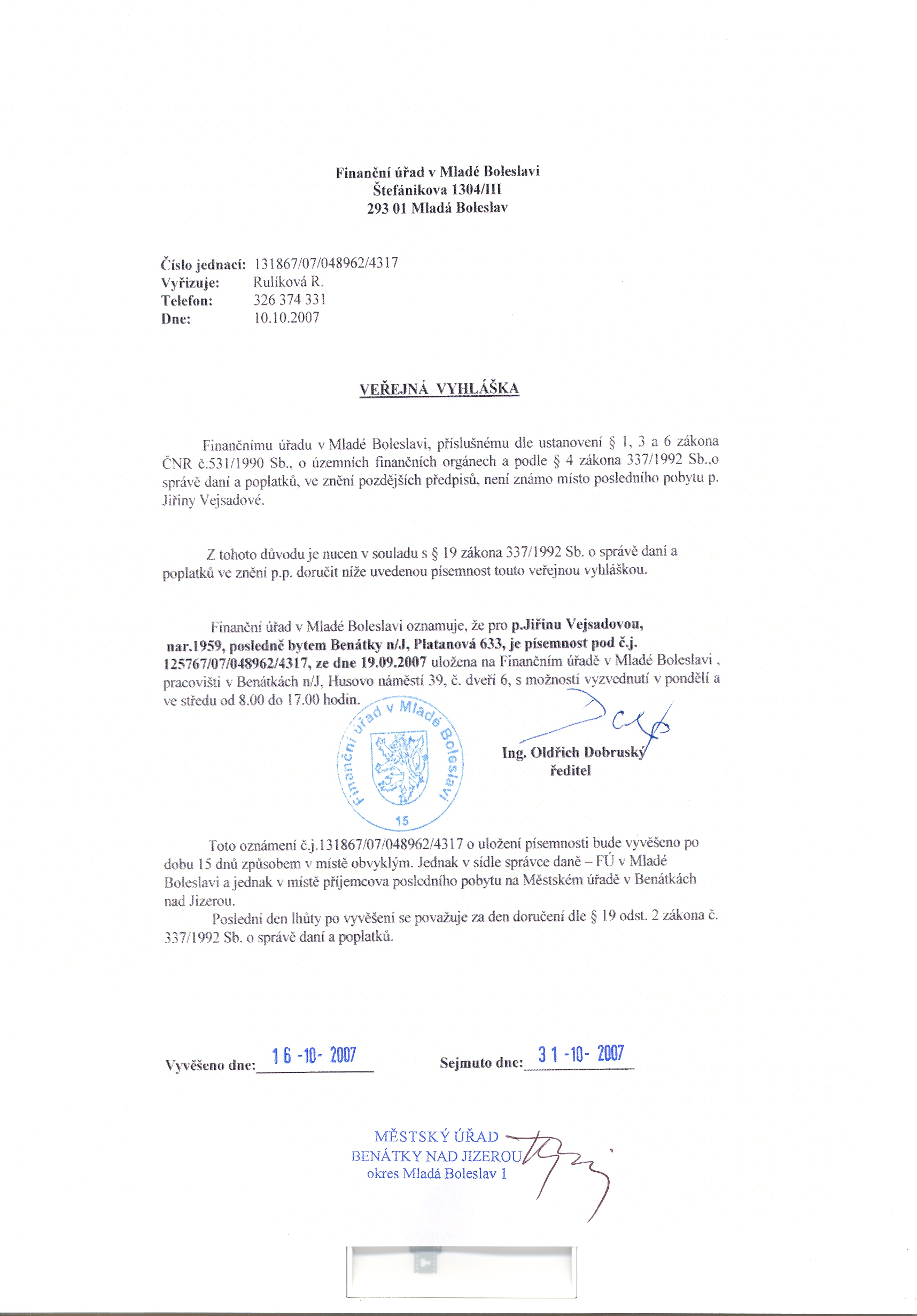 Finanční úřad v Mladé Boleslavi, Štefánikova 1304/III, 293 01 Mladá Boleslav Oznámení o uložení písemnosti