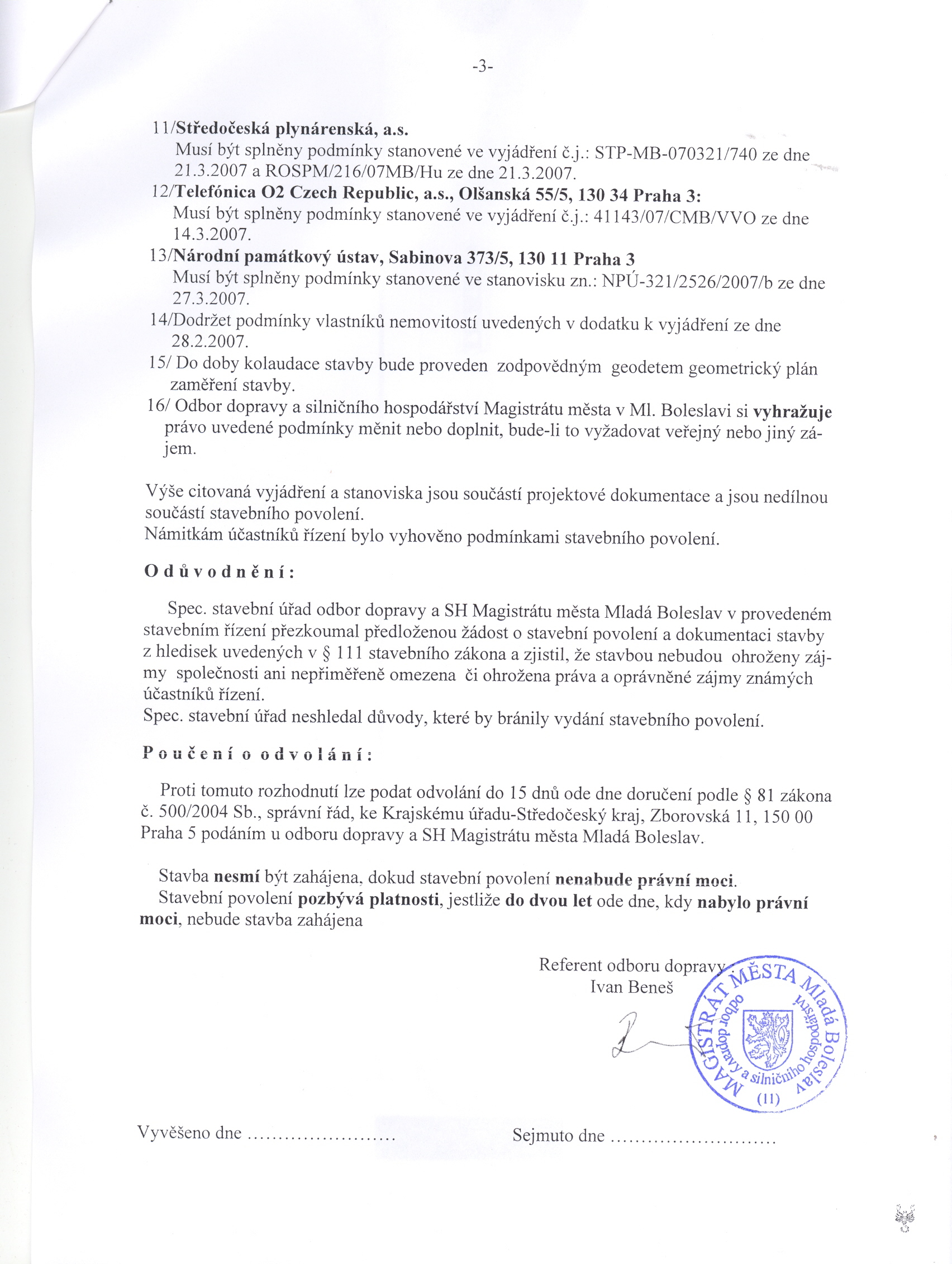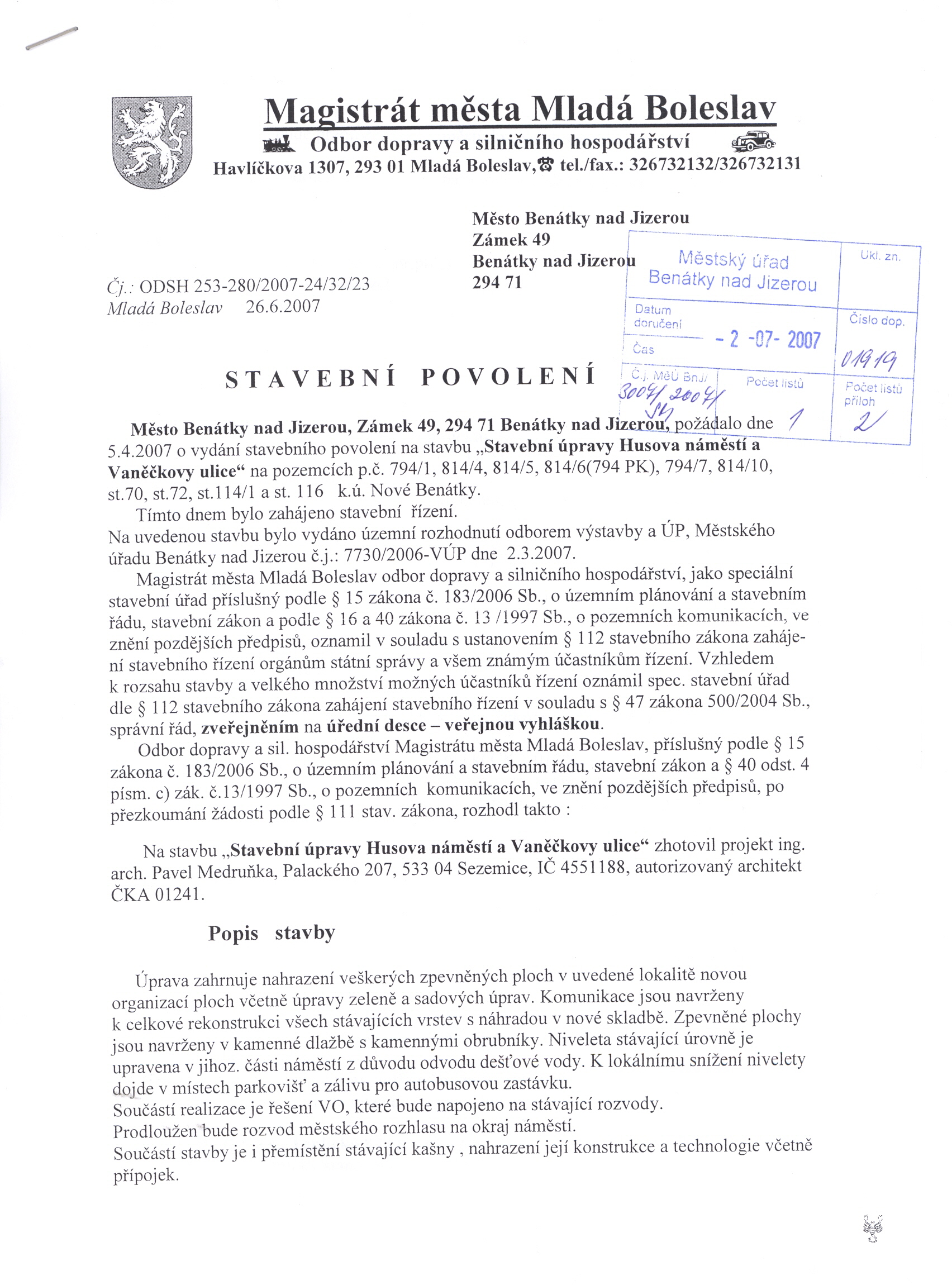 Městský úřad, odbor výstavby a územního plánování, Zámek 49, 294 71 Benátky nad Jizerou Rozhodnutí