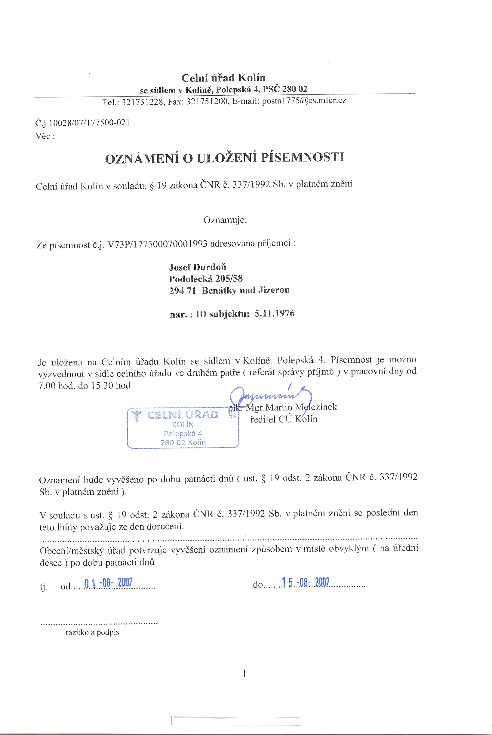 Celní úřad Kolín, Polepská 4, 280 02 Kolín Oznámení o uložení písemnosti