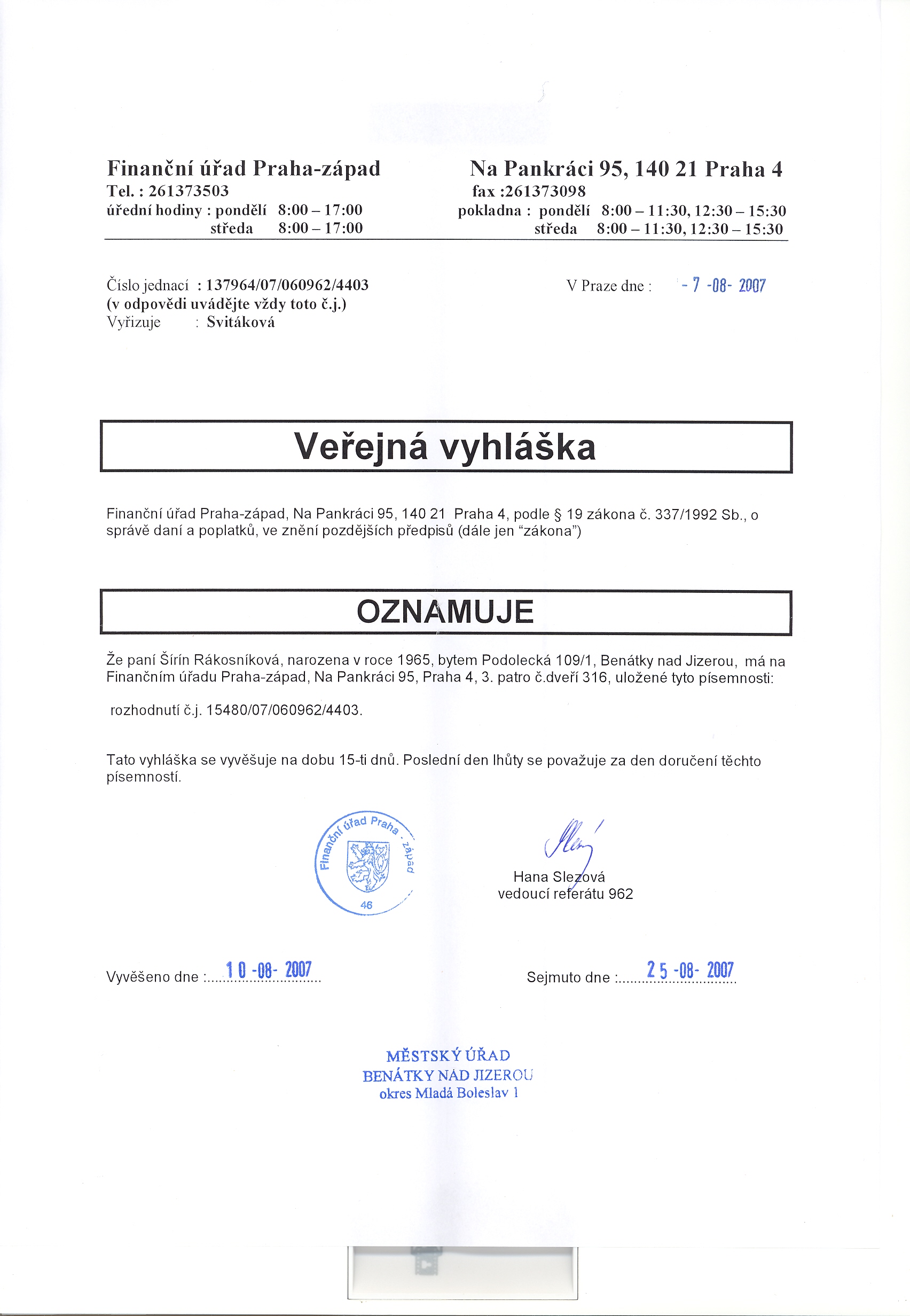 Vyvěšení: 16.8.2007 Sejmutí: 25.8.2007