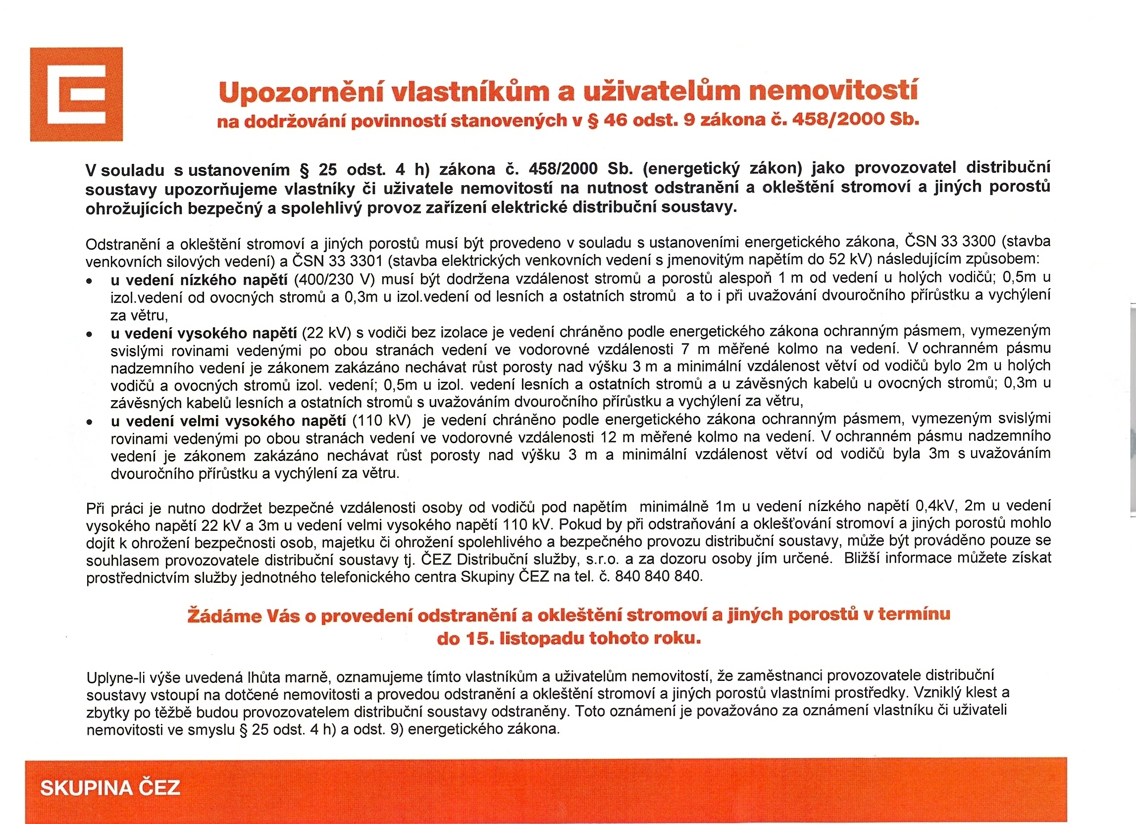 ČEZ Distribuční služby, s.r.o., 28. října 3123/152, Ostrava Upozornění vlastníkům a uživatelům nemovitostí