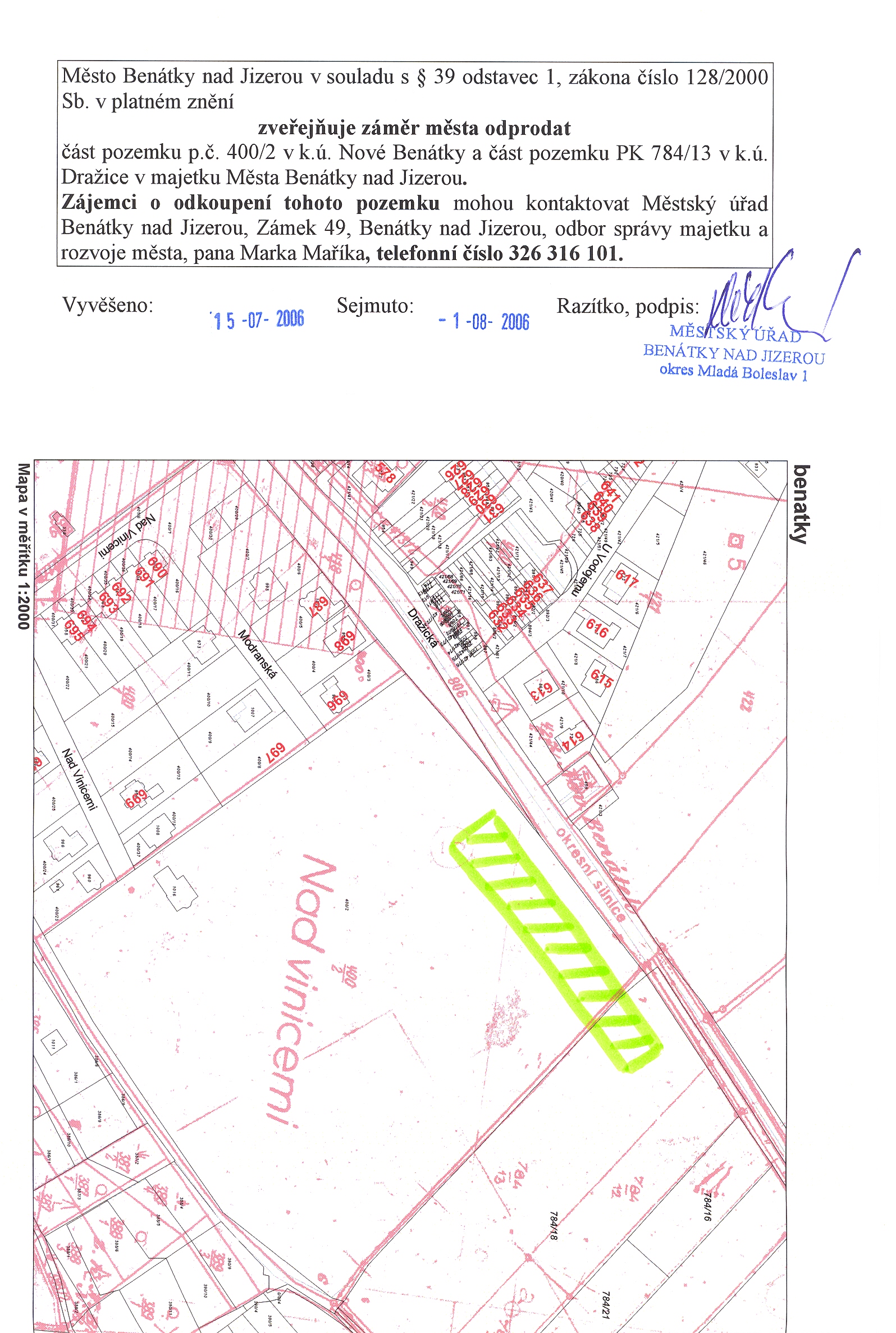 Město Benátky nad Jizerou, Zámek 49, Benátky n. J. Záměr města odprodat pozemek