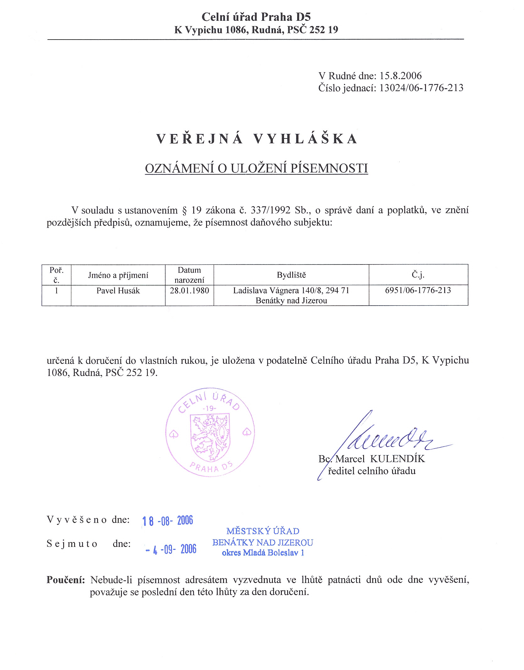 Celní úřad Prha D5, K Vypichu 1086, Rudná Oznámení o uložení písemnosti