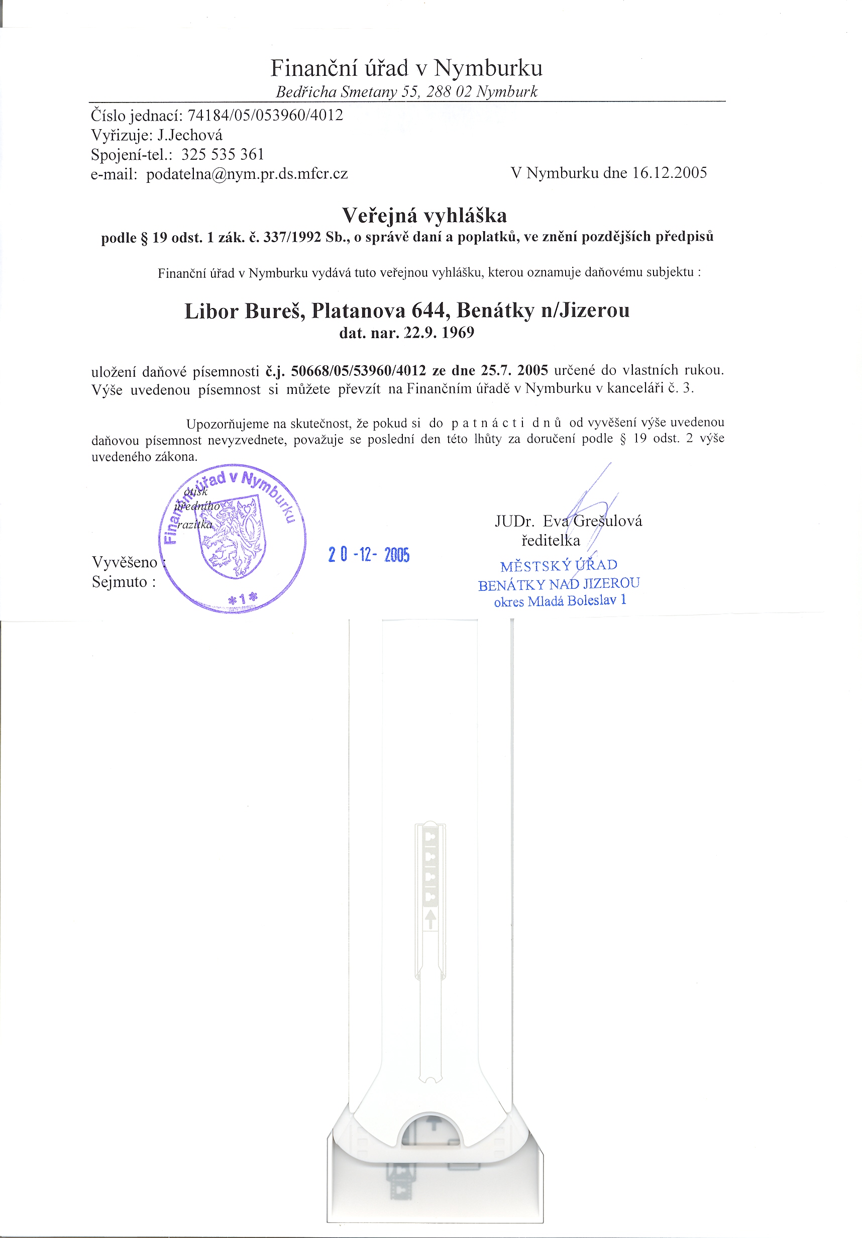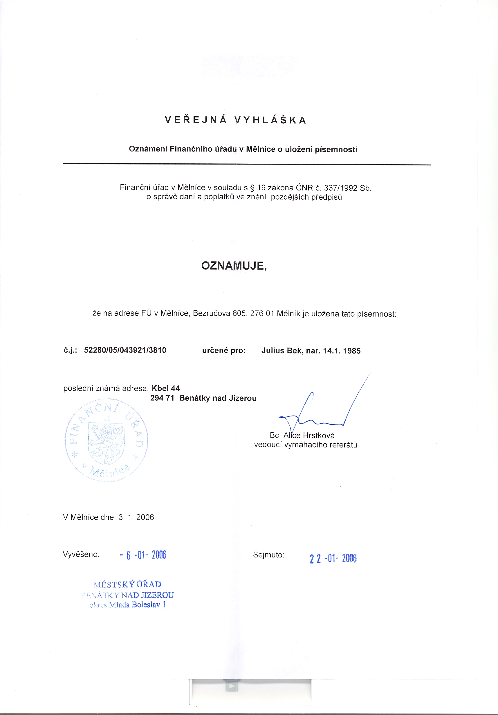 Finanční úřad v Mělníce, Bezručova 605, Mělník Doručení písemnosti veřejnou vyhláškou