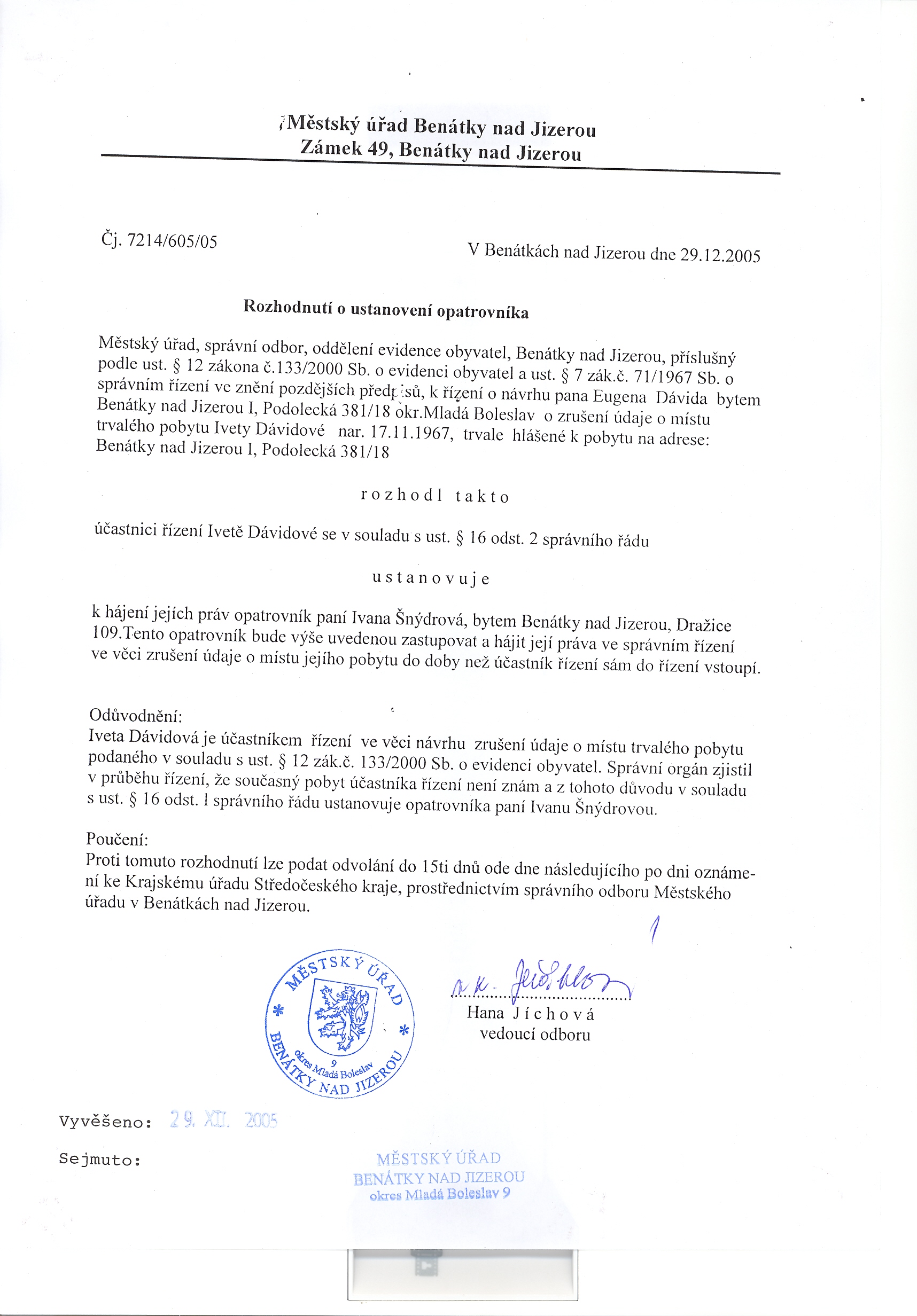 Městský úřad Benátky nad Jizerou, odbor správní a sociální Rozhodnutí o ustanovení opatrovníka