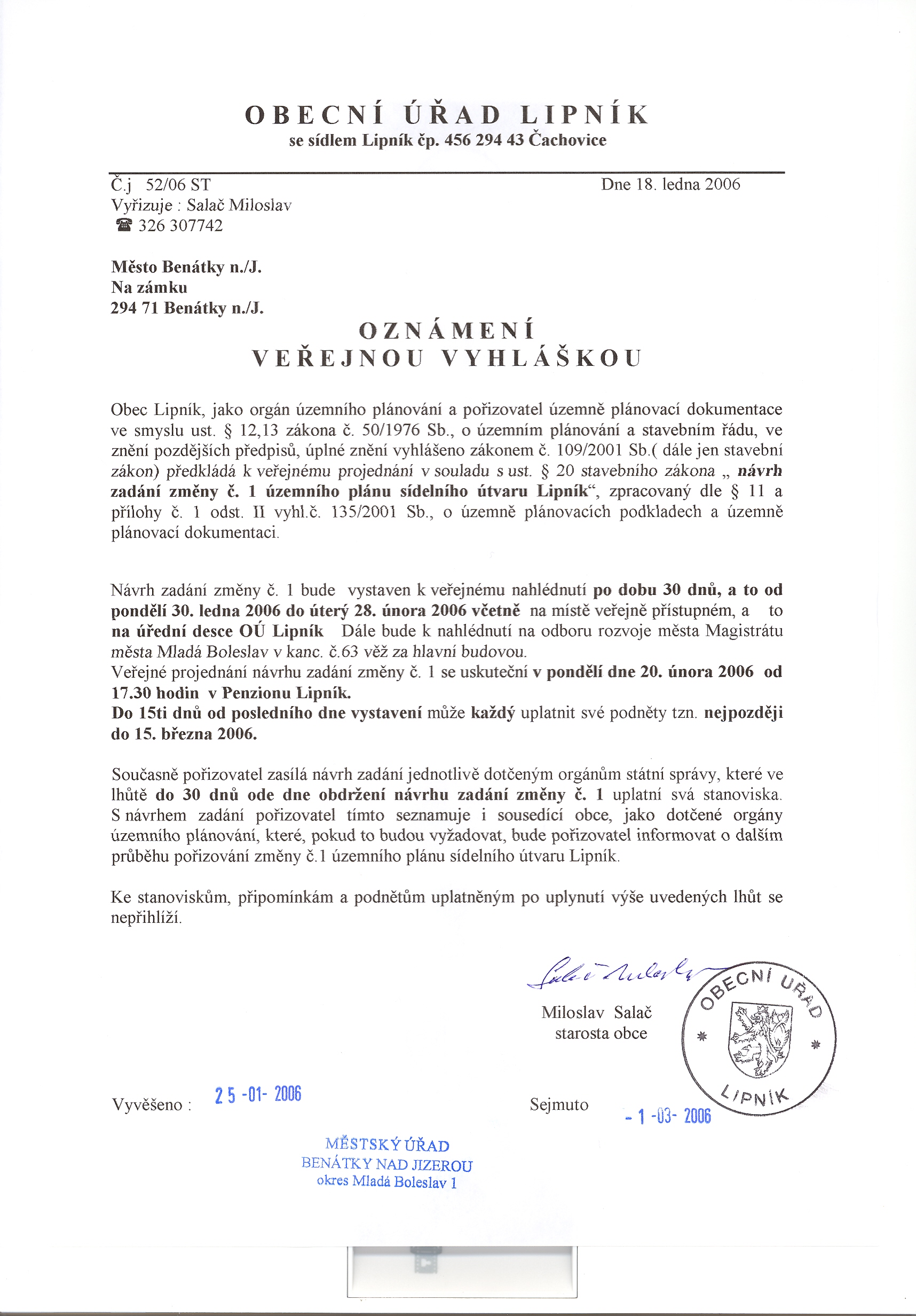 Obecní úřad Lipník, čp. 456, 294 43 Čachovice Oznámení veřejnou vyhláškou