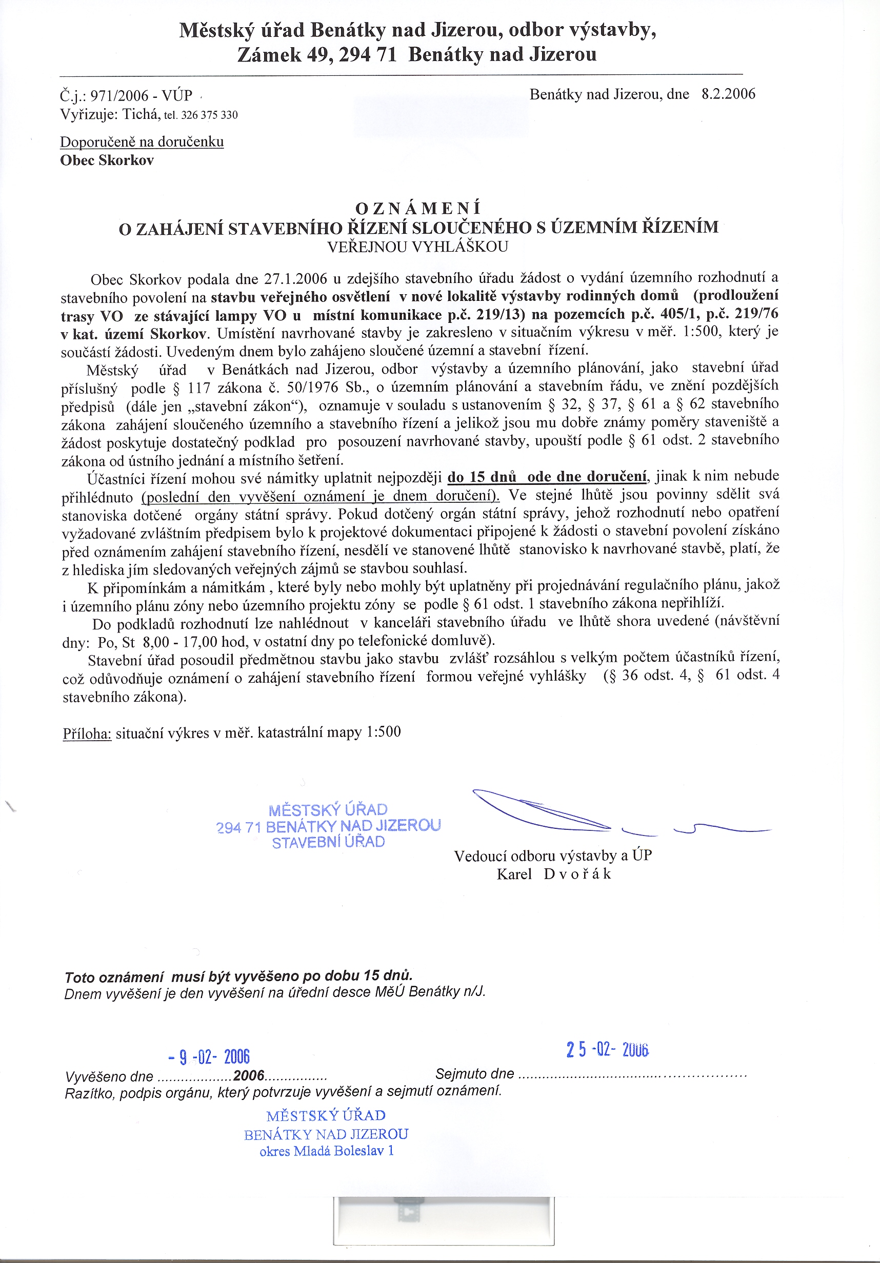 Městský úřad Benátky nad Jizerou, odbor výstavby, Zámek 49, 294 71 Benátky nad Jizerou Oznámení